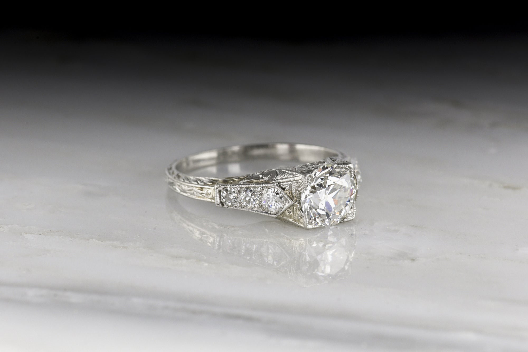 Sold OutEdwardian GIA Certified 1.10 Carat Old European Cut Diamond Engagement Ring with Ornate Hand-Engraving