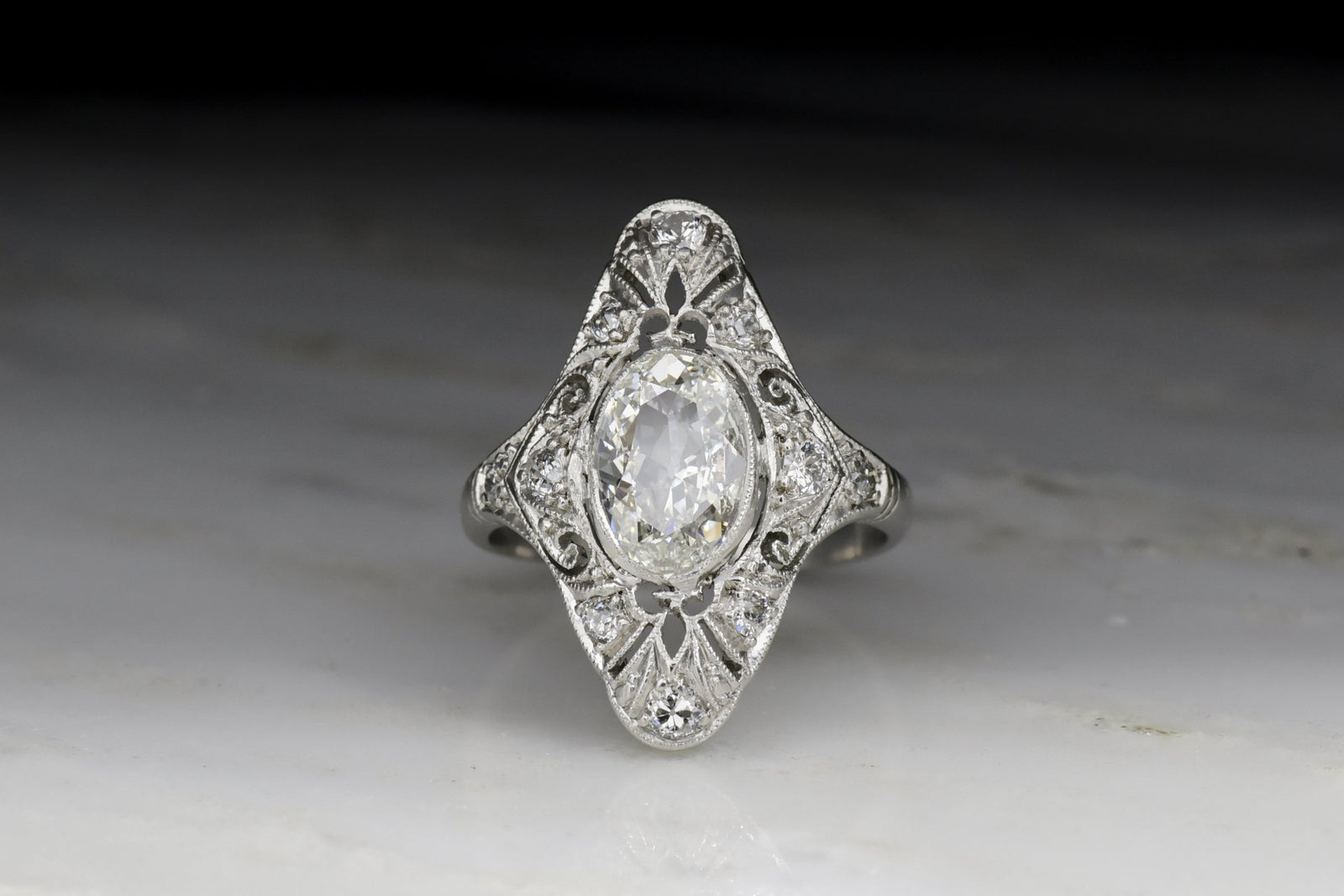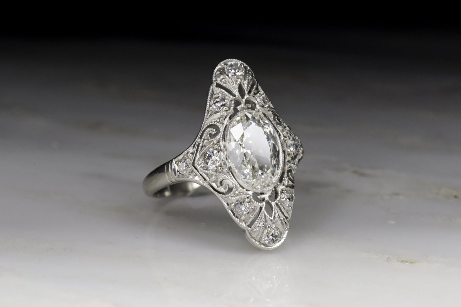 Sold OutAntique Edwardian, Art Deco Women's Diamond Ring with Ornate Open Filigree and Oval Cut Diamond Center