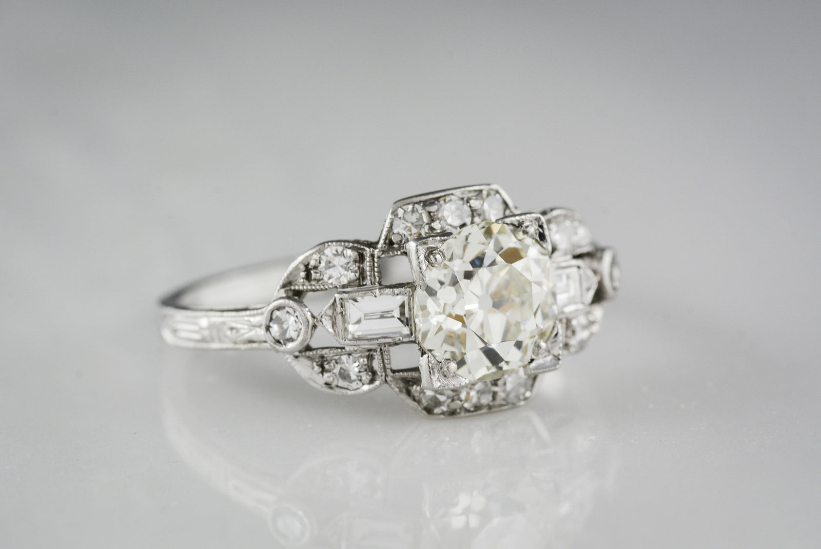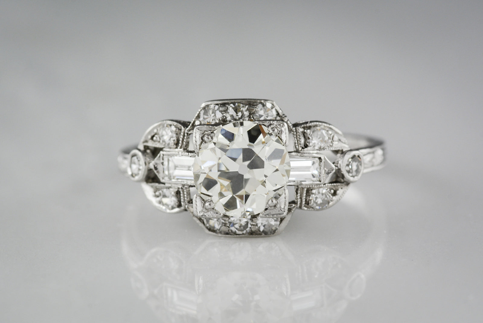 Sold Out1.30 Carat Old European Cut Diamond in Edwardian / Art Deco Platinum Engagement Ring with Baguette (Emerald) and Single Cut Diamond Accents