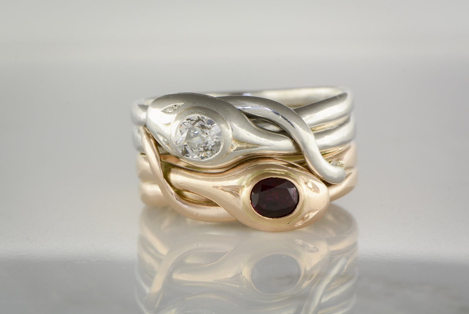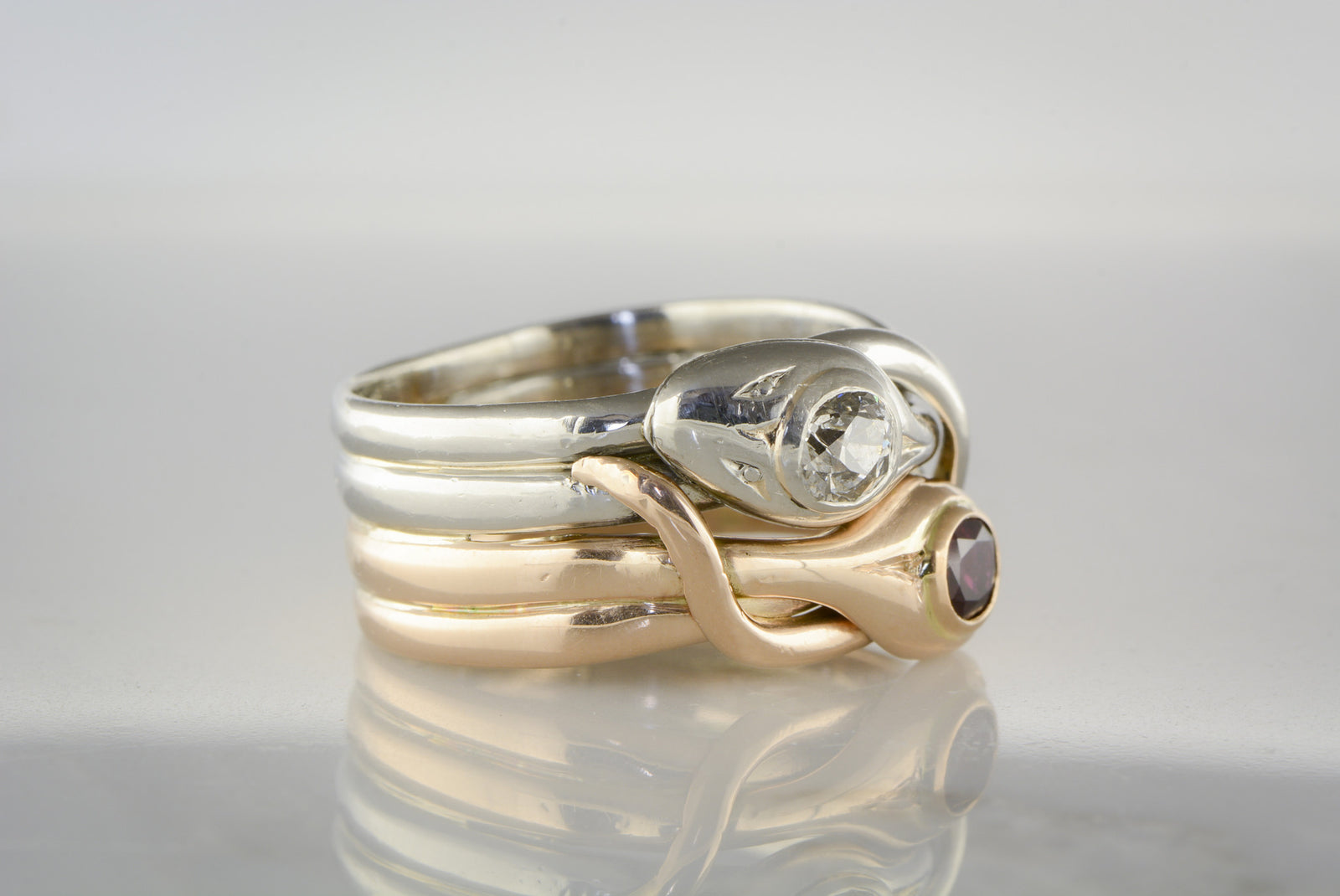 Sold OutVictorian Mine Cut Diamond and Garnet, Platinum and Rose Gold Snake / Serpent Ring
