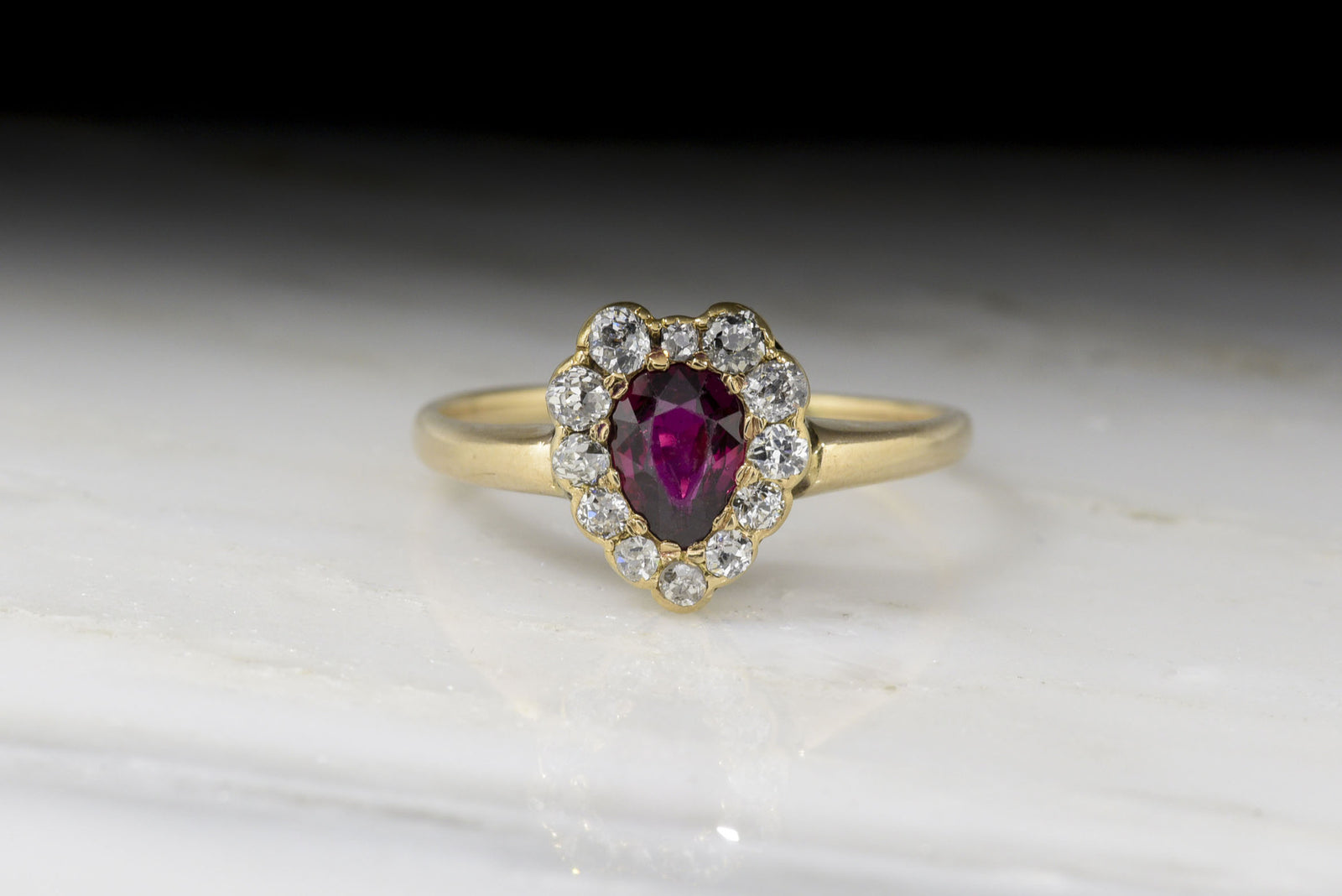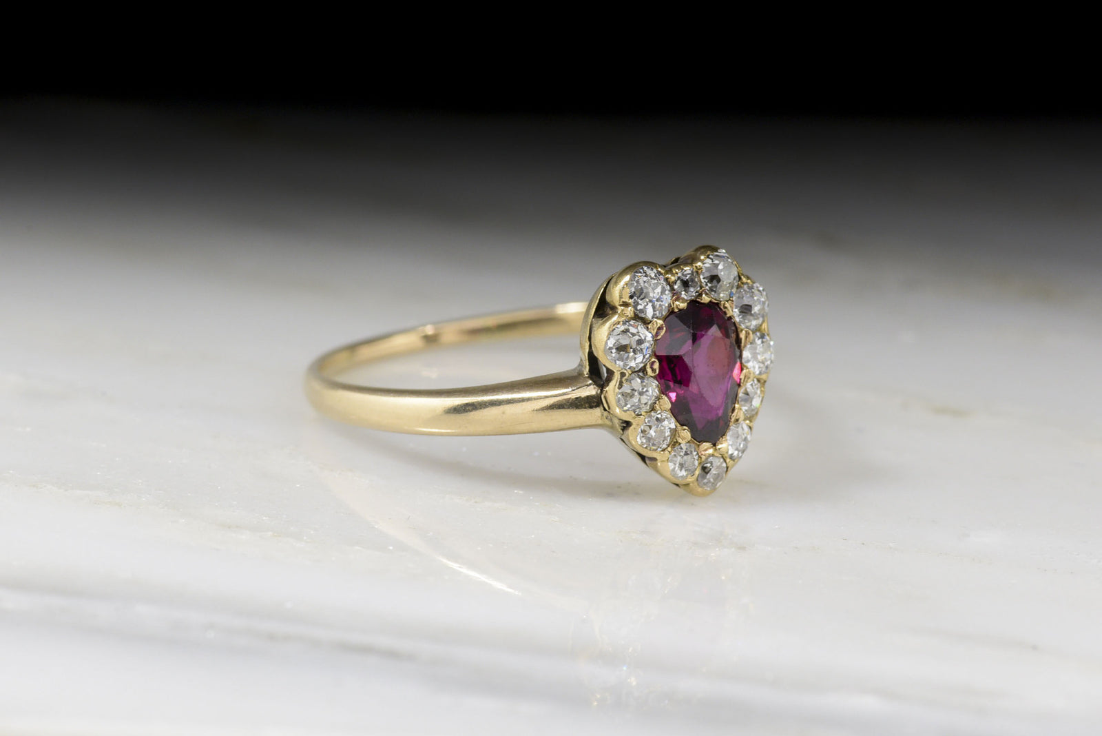 Sold Out.75 Carat Pear Cut Ruby in c. 1900 Victorian 14K Rose Gold Heart Shaped Engagement Ring with Old Mine Cut Diamond Halo