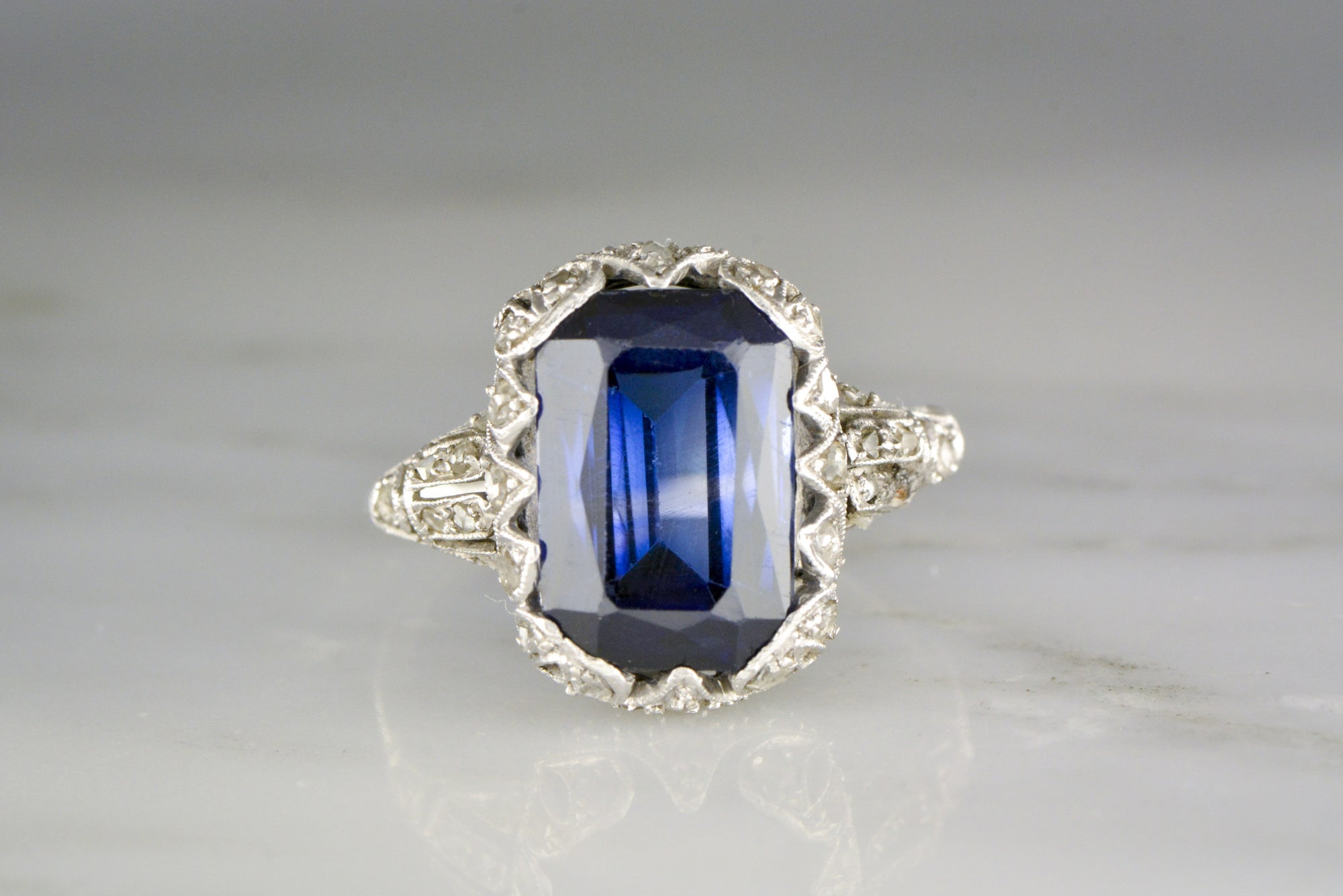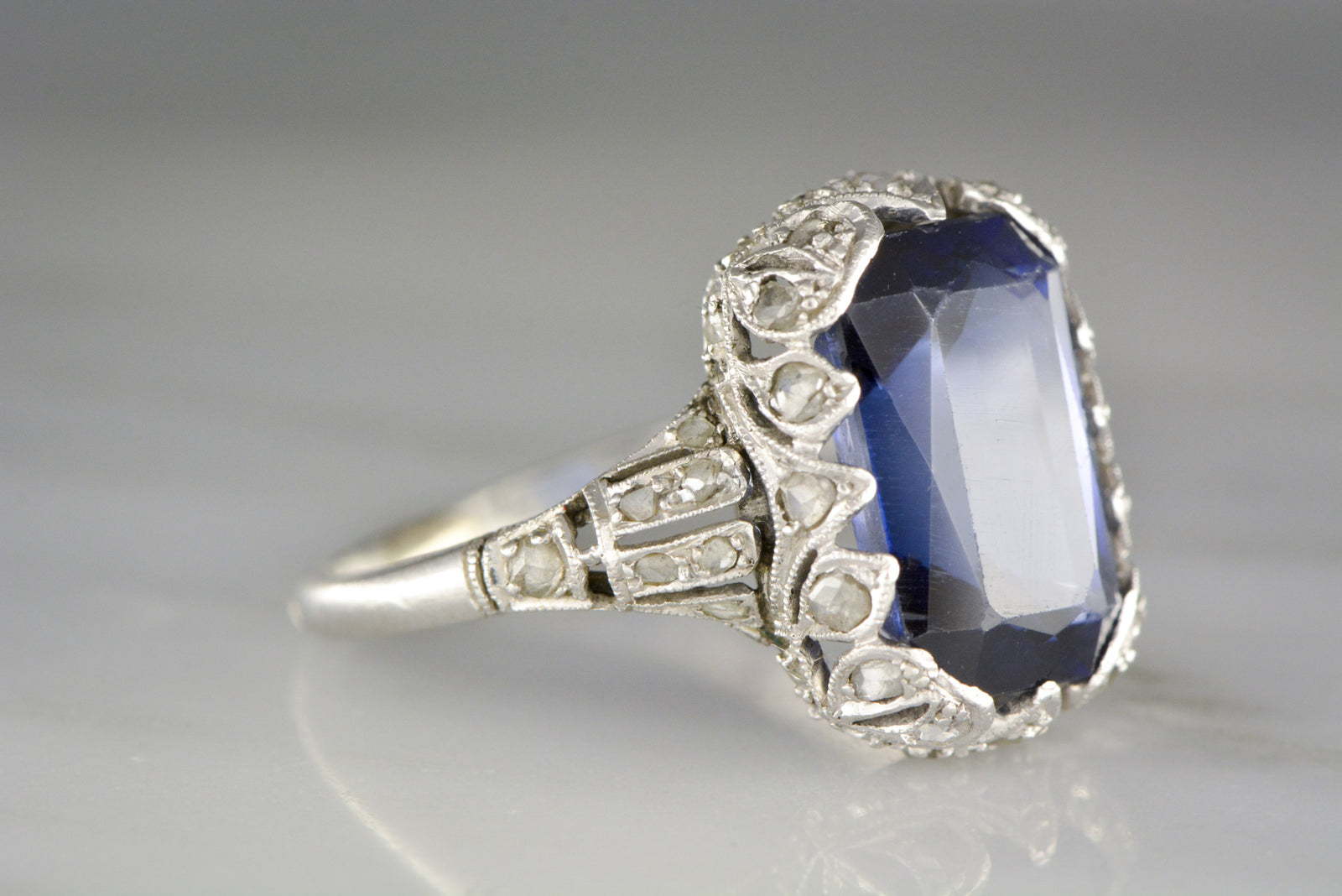 Sold OutFrench Edwardian Platinum Ring with an Emerald/Scissor Cut Created Sapphire and .50 ctw Rose Cut Diamonds