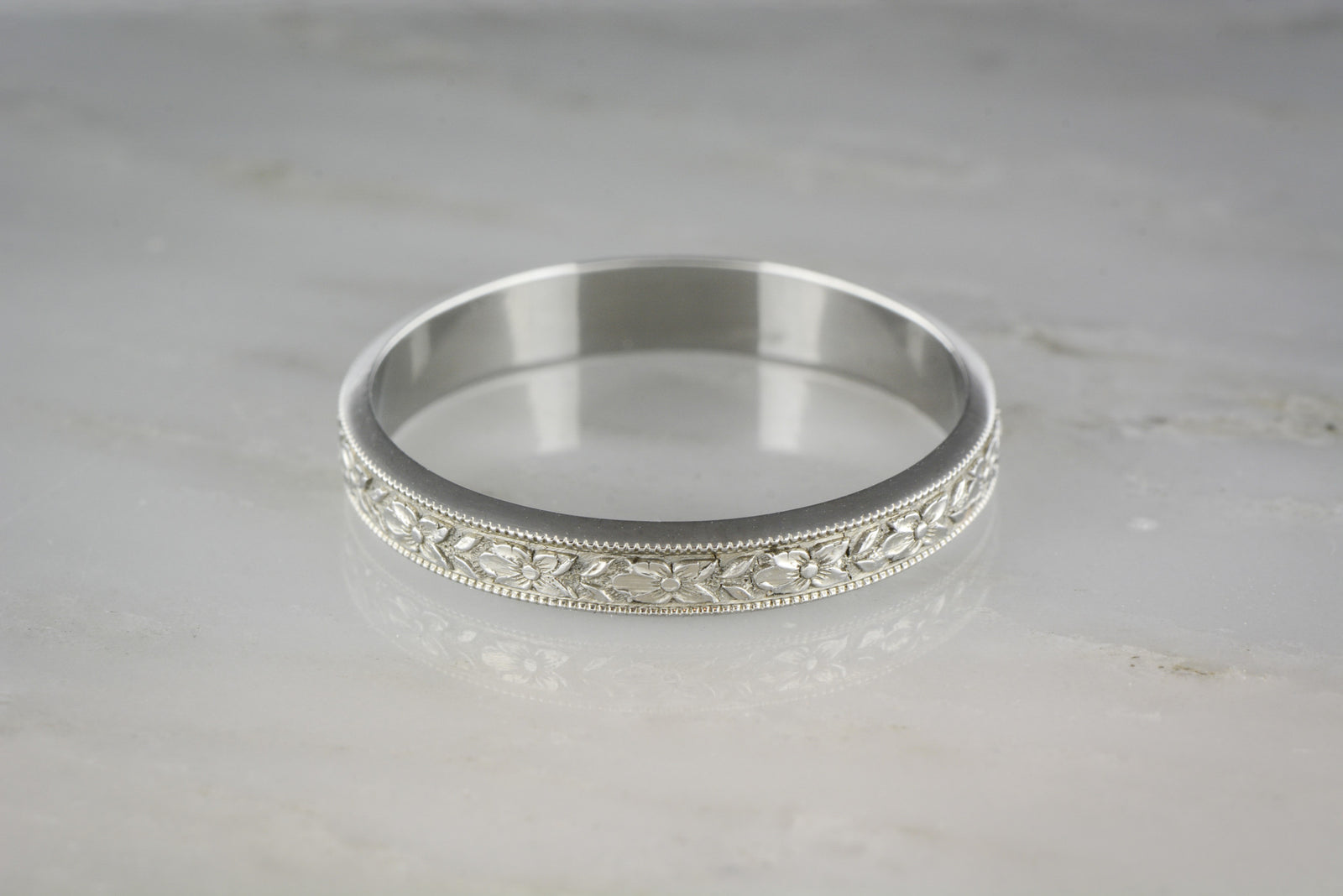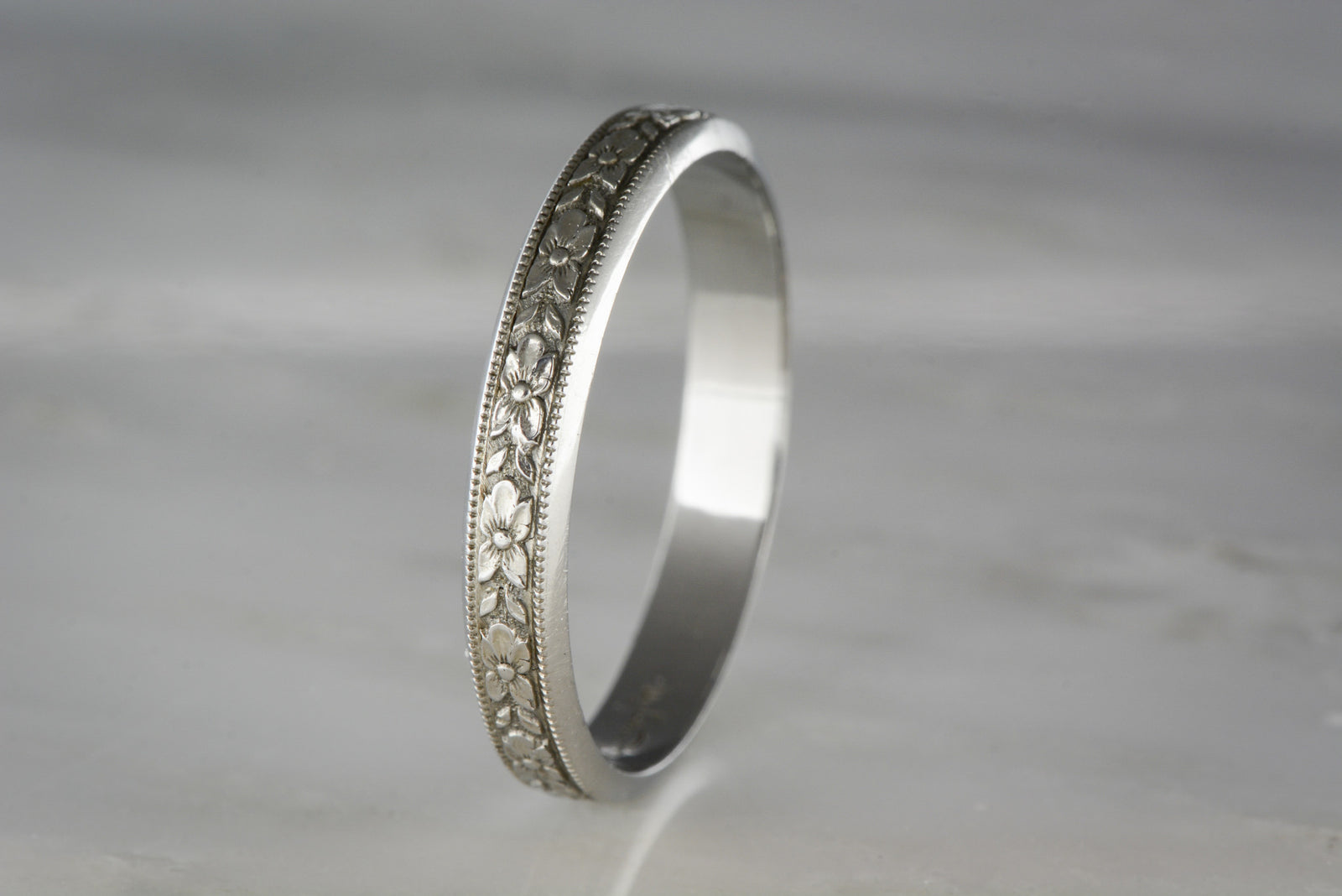 Sold OutAntique Victorian / Art Deco Men's "Lohengrin" 18K White Gold Wedding Band Engraved with Orange Blossom and Leaf Motif