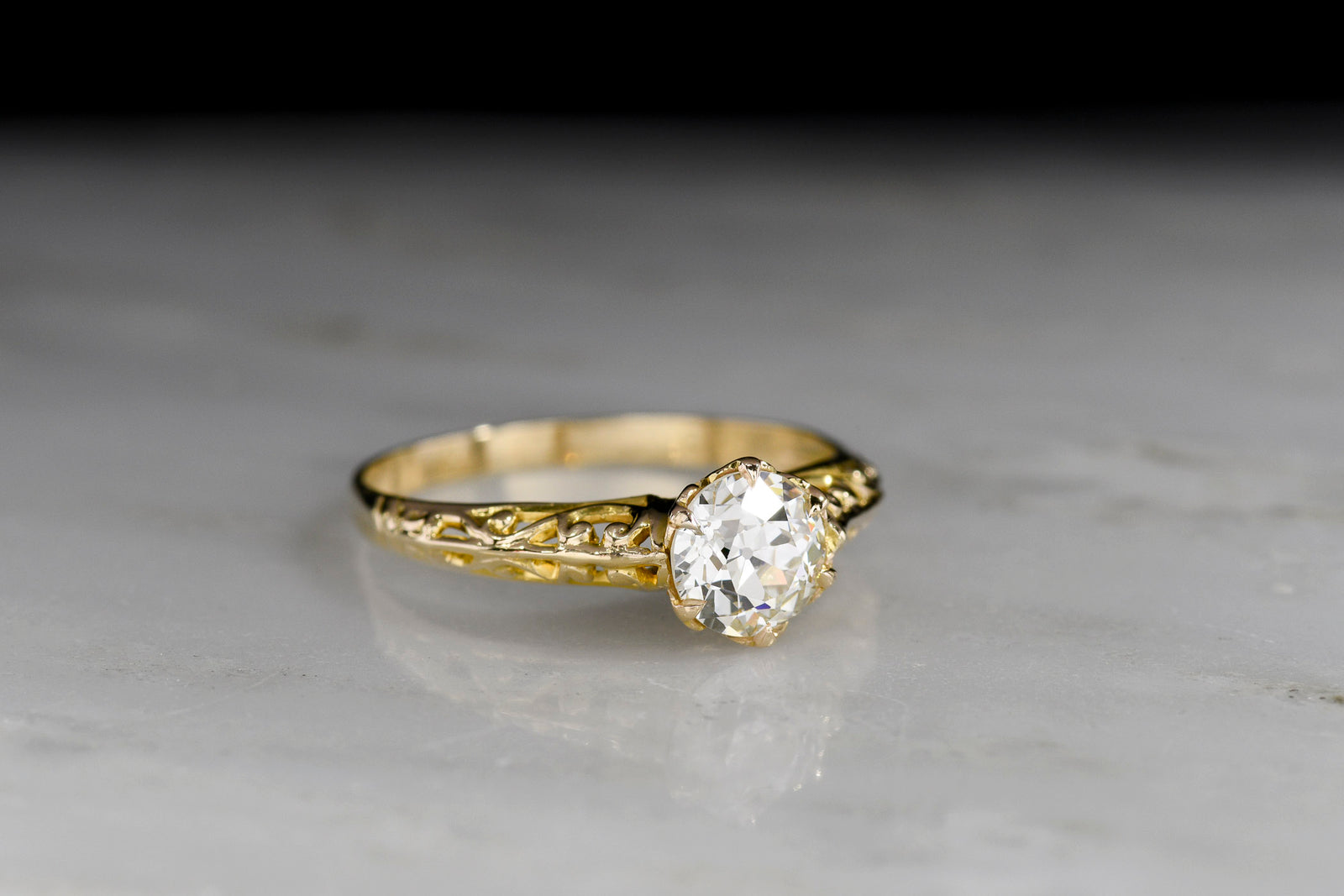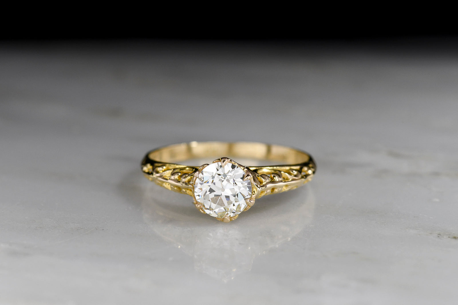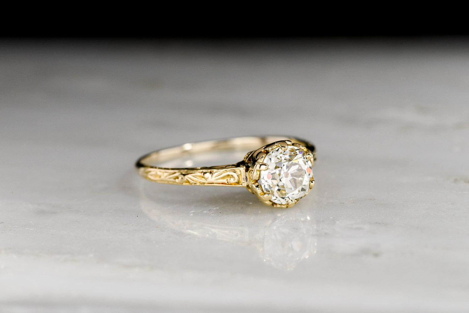 Sold Outc. 1900 - 1920s Hand-Engraved Gold Solitaire Engagement Ring with a Subtle Fleur de Lis Basket