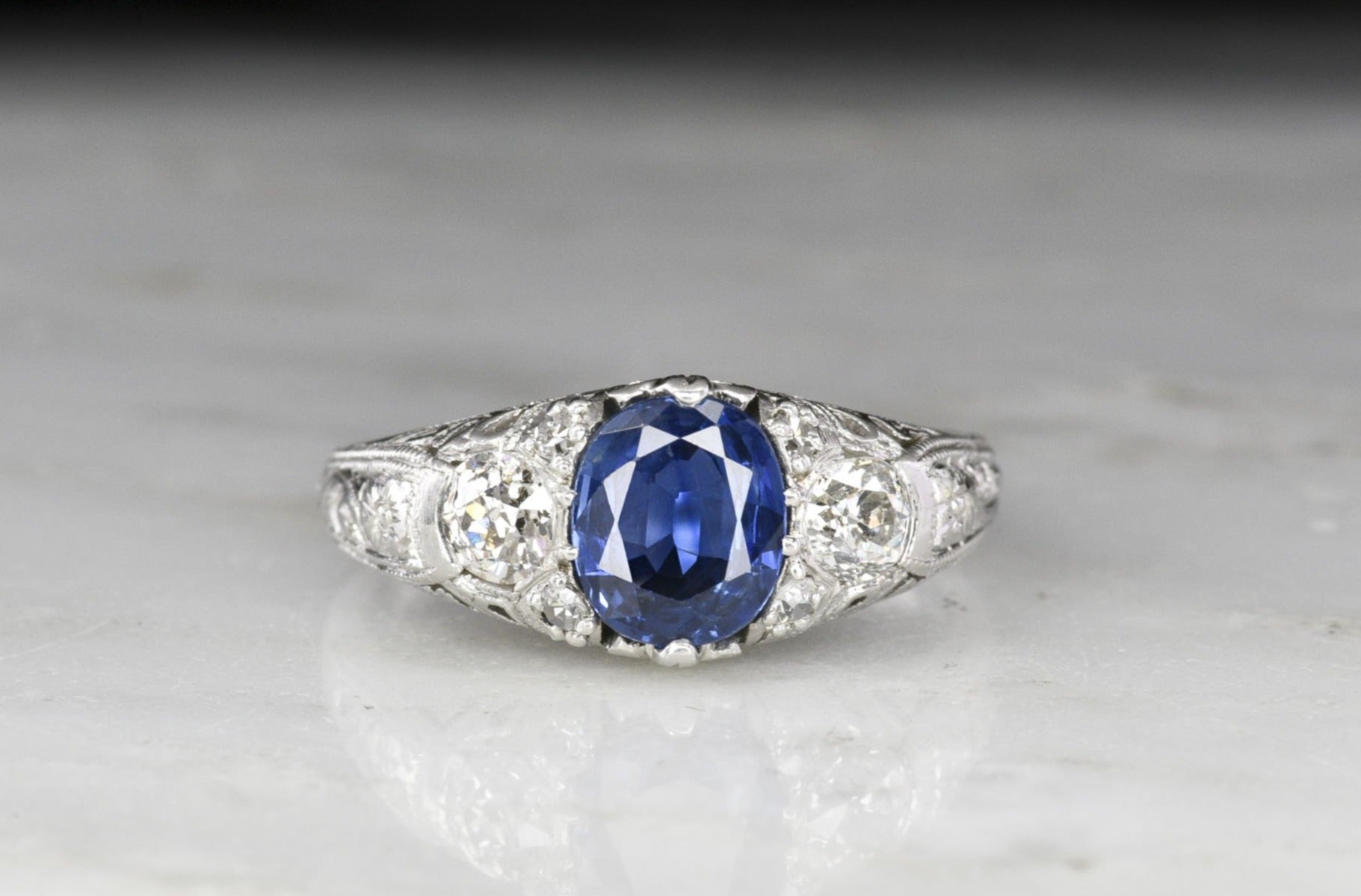 Sold OutEarly 1900s Edwardian "Beattie & Sons" Oval Cut Sapphire, Diamond, and Platinum Ring