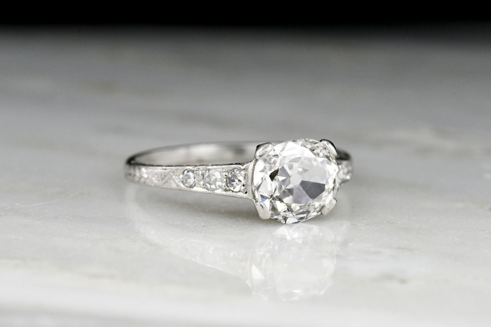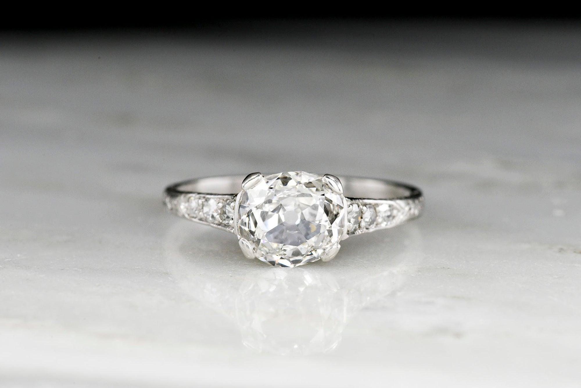 Sold OutEdwardian Platinum Engagement Ring with an Old Mine Cushion Cut Diamond Center