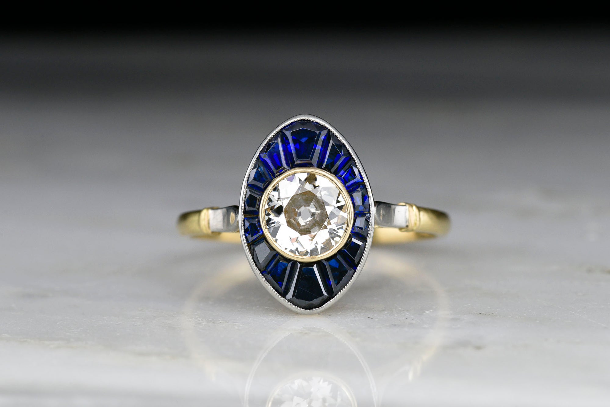 Sold OutEarly 1900s Gold and Platinum Ring with Calibré Cut Sapphires and an Old European Cut Diamond Center