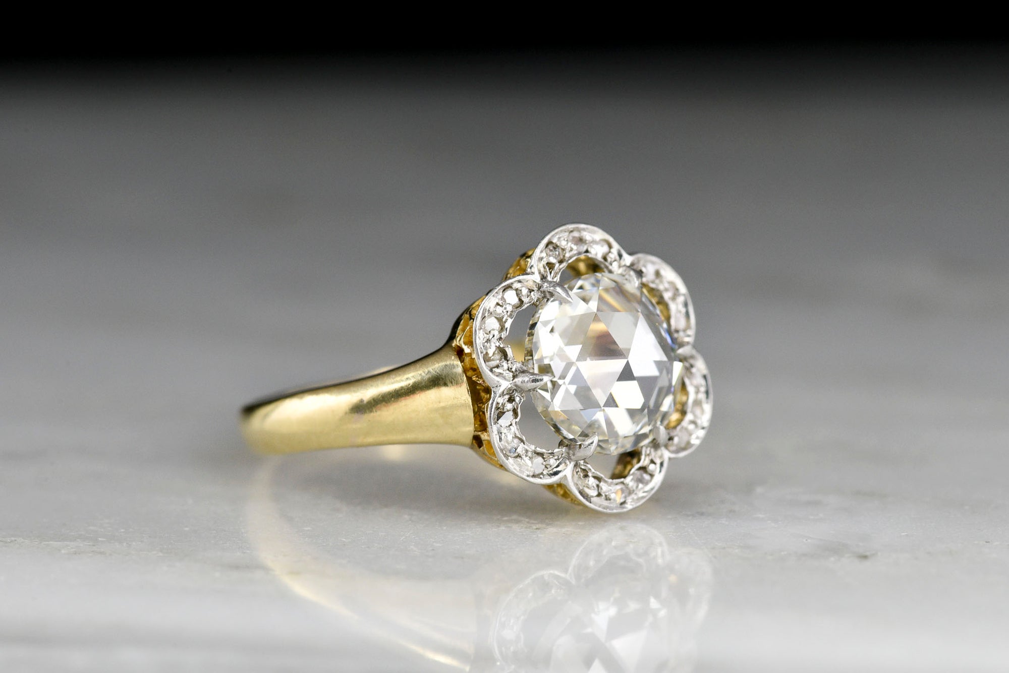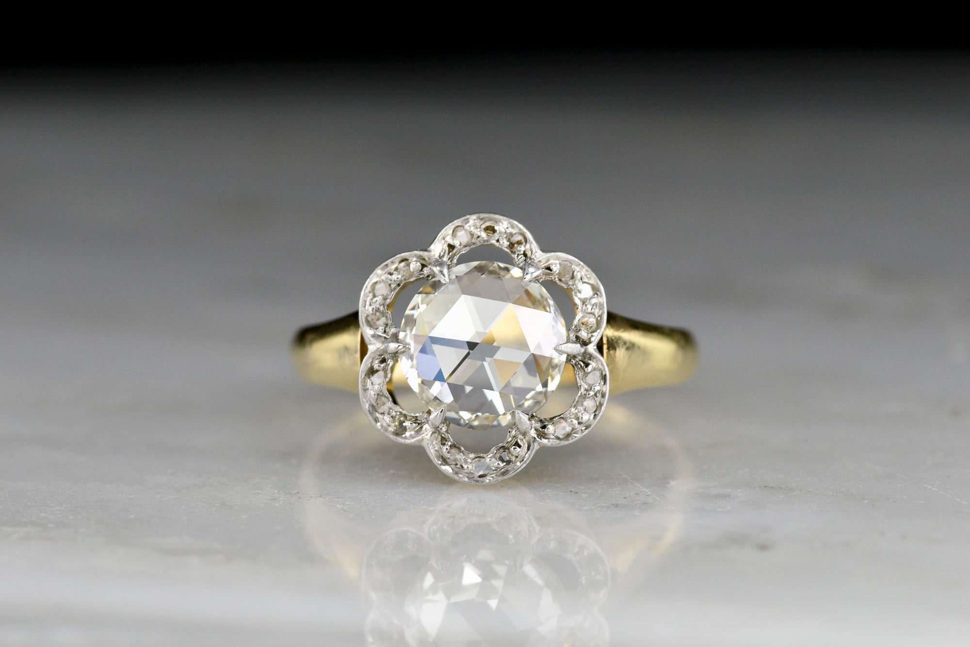 Sold OutBelle Époque Gold and Platinum Ring with a Floating Floral Halo and Rose Cut Diamond Center