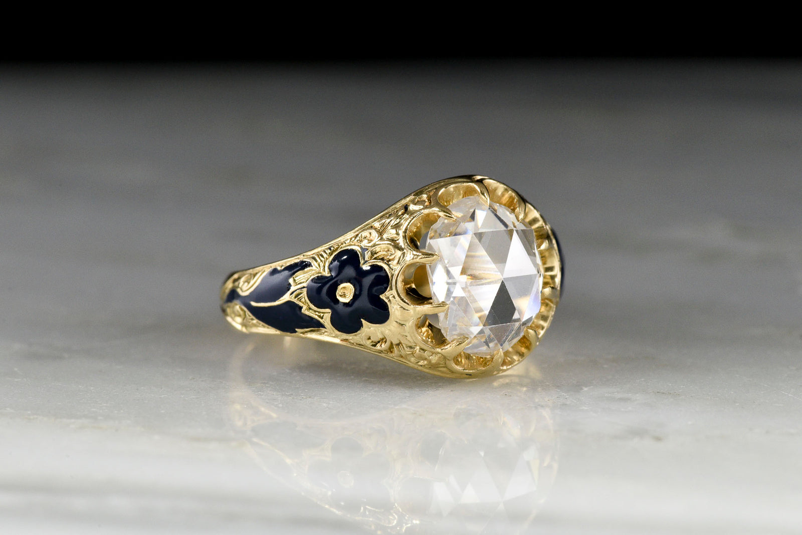 Sold OutVictorian 18K Gold and Blue Enamel Belcher Ring with an Antique Rose Cut Diamond Center