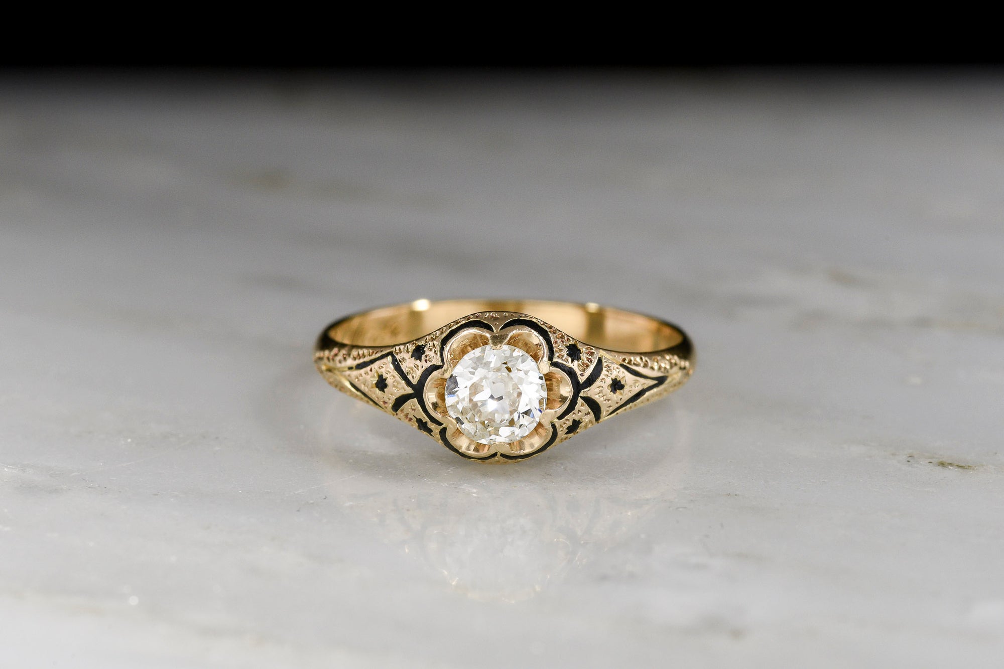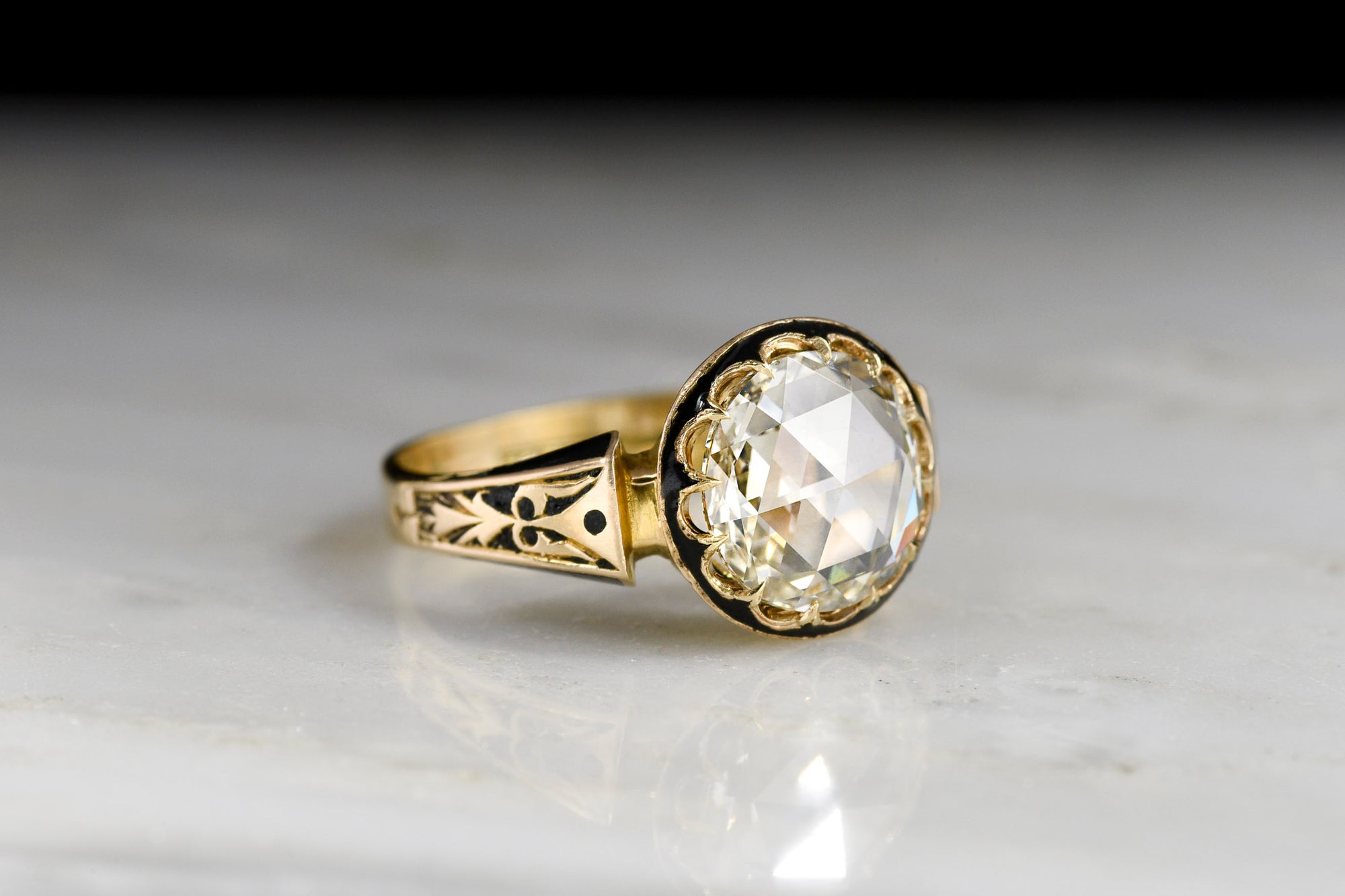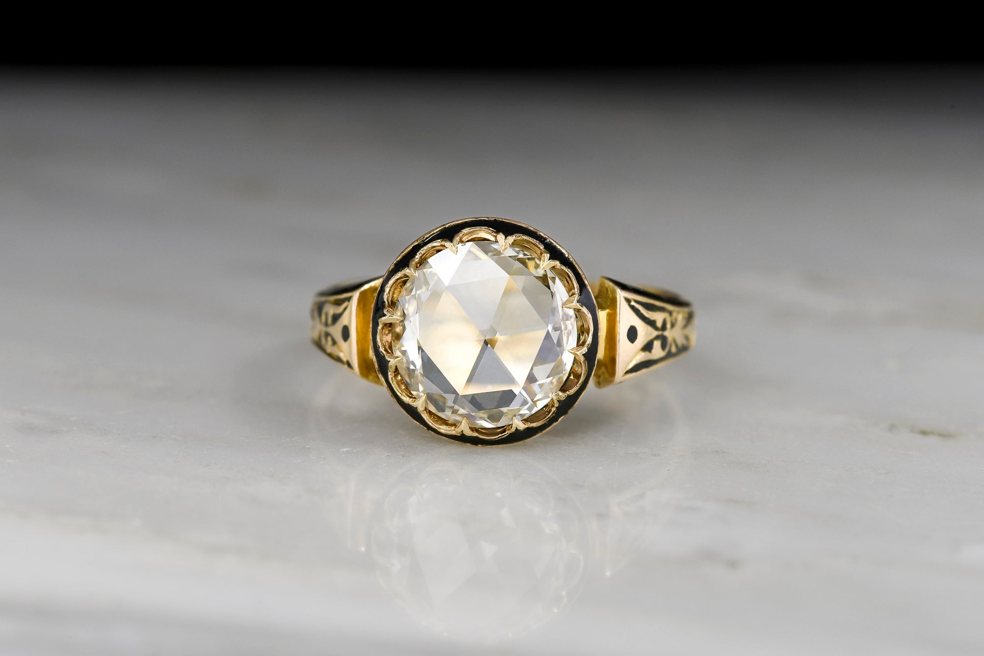 Sold OutVictorian Gold and Black Enamel Ring with a 1.51 Carat Round Rose Cut Diamond