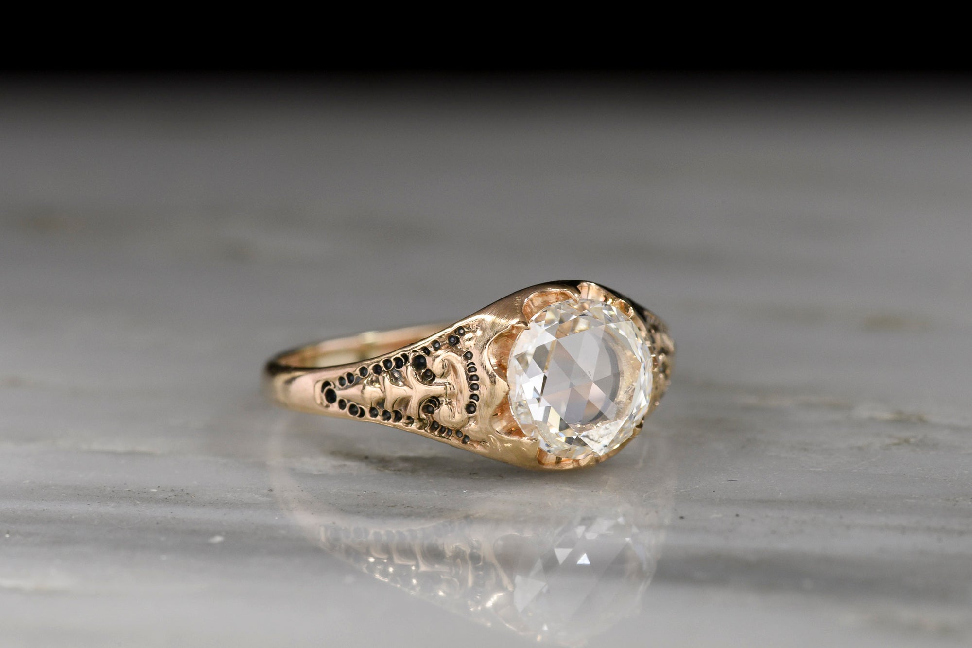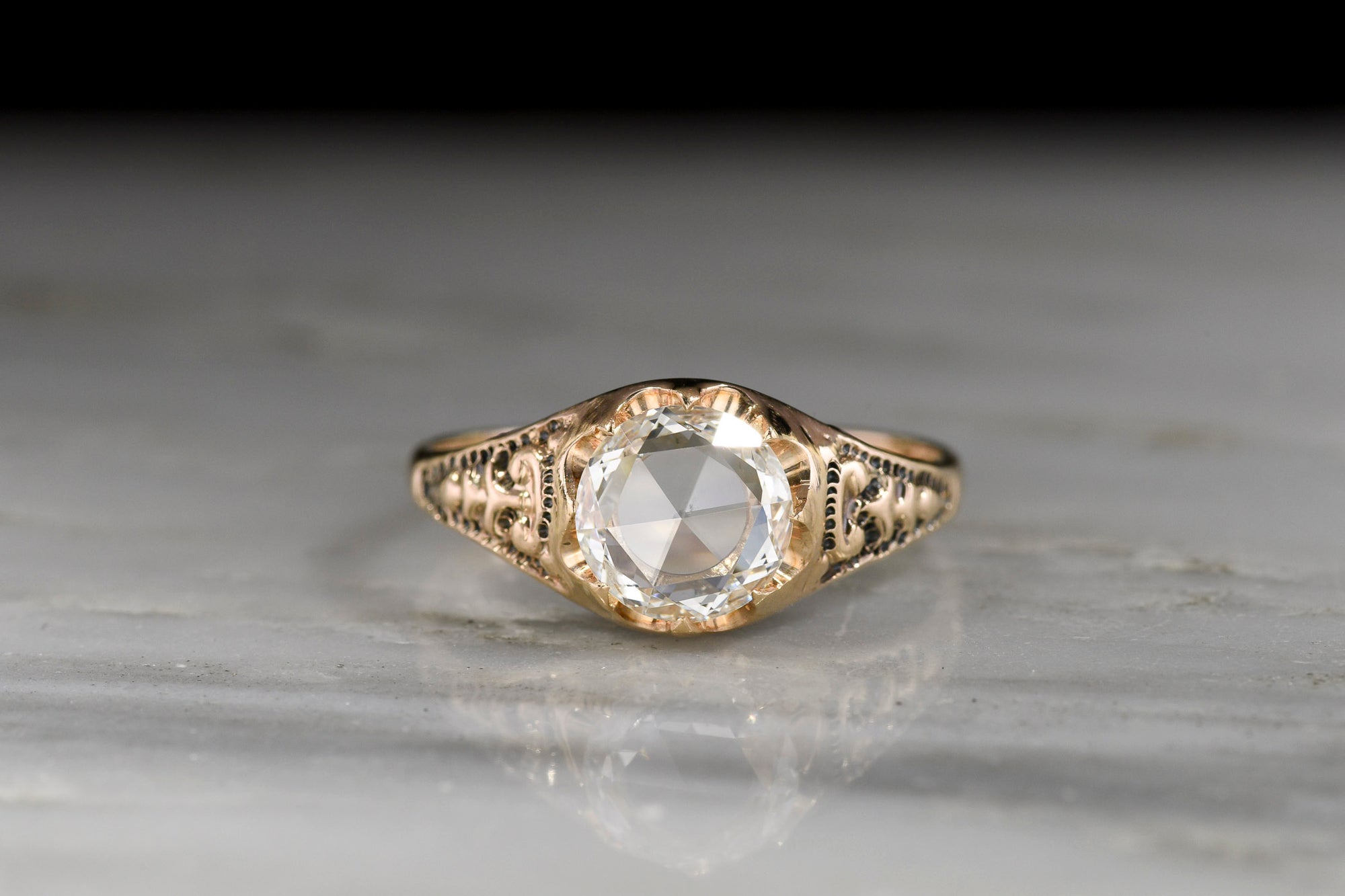 Sold OutLate-1800s Victorian Belcher Ring with a Round Rose Cut Diamond and Deep-Relief Shoulders
