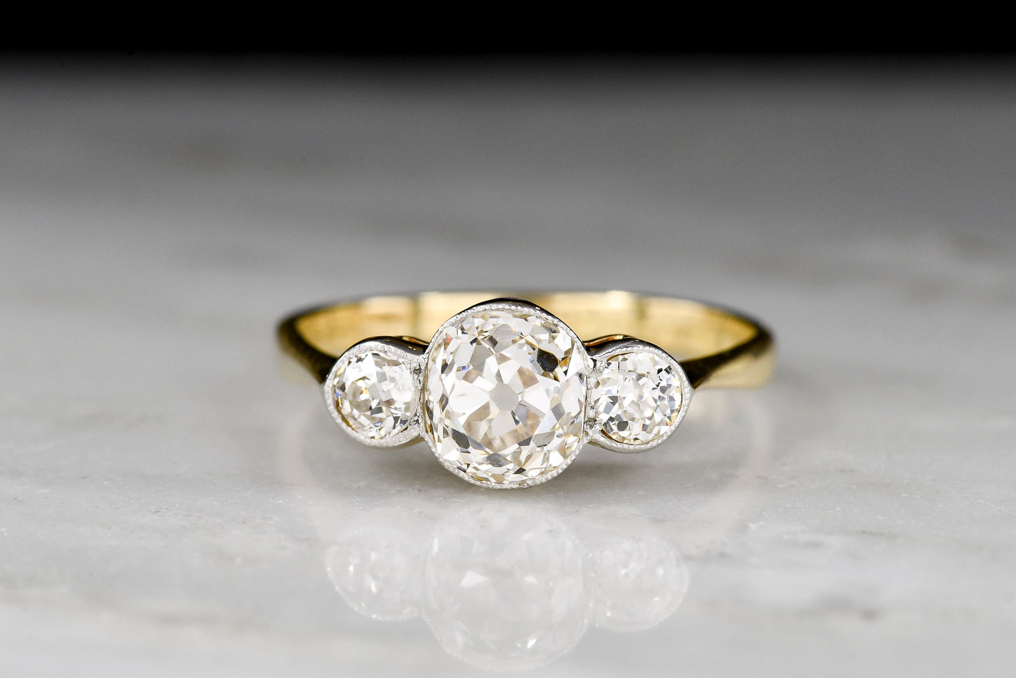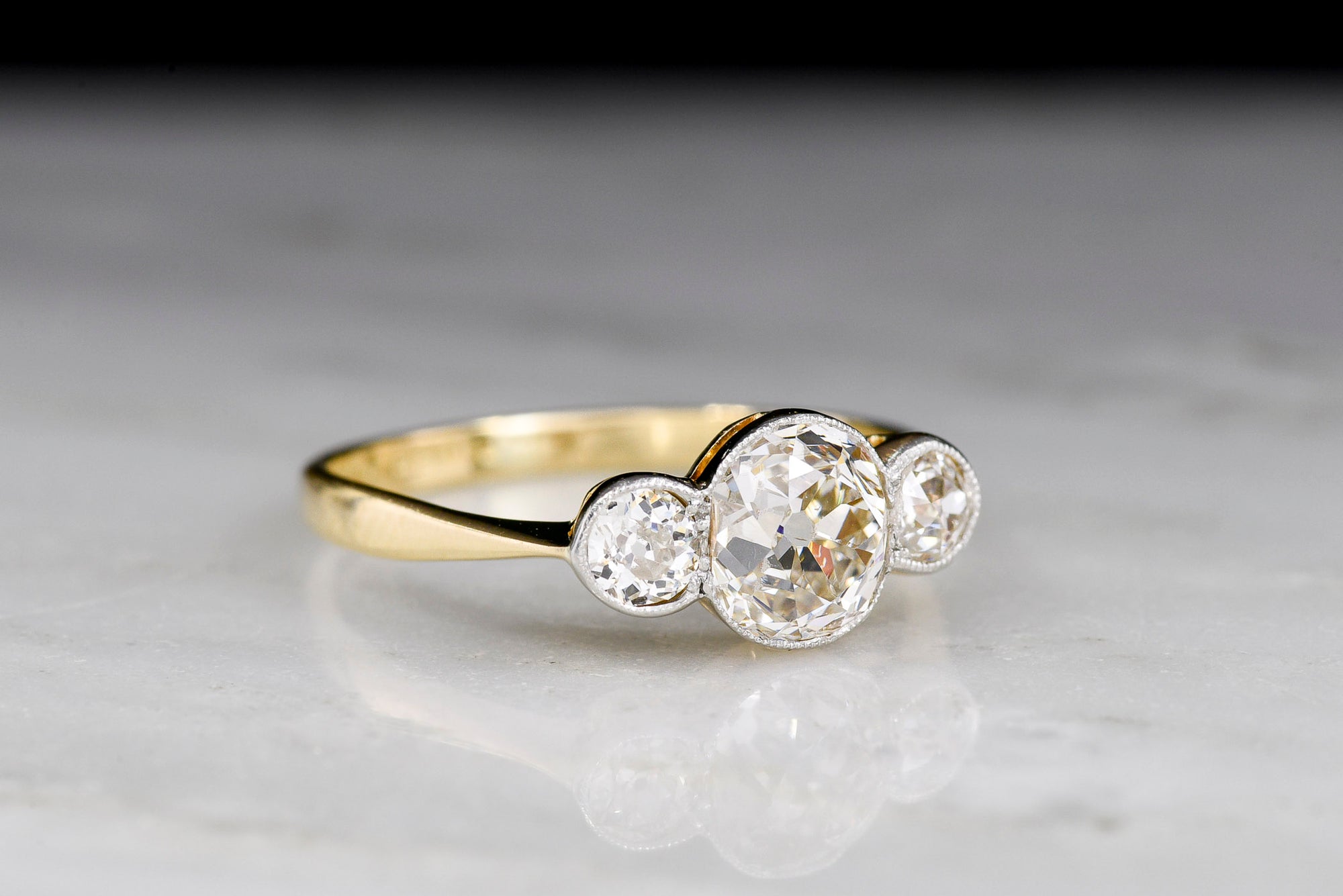 Sold Outc. 1900-1910 Belle Époque Gold and Platinum Three Stone Old Mine Cut Diamond Ring