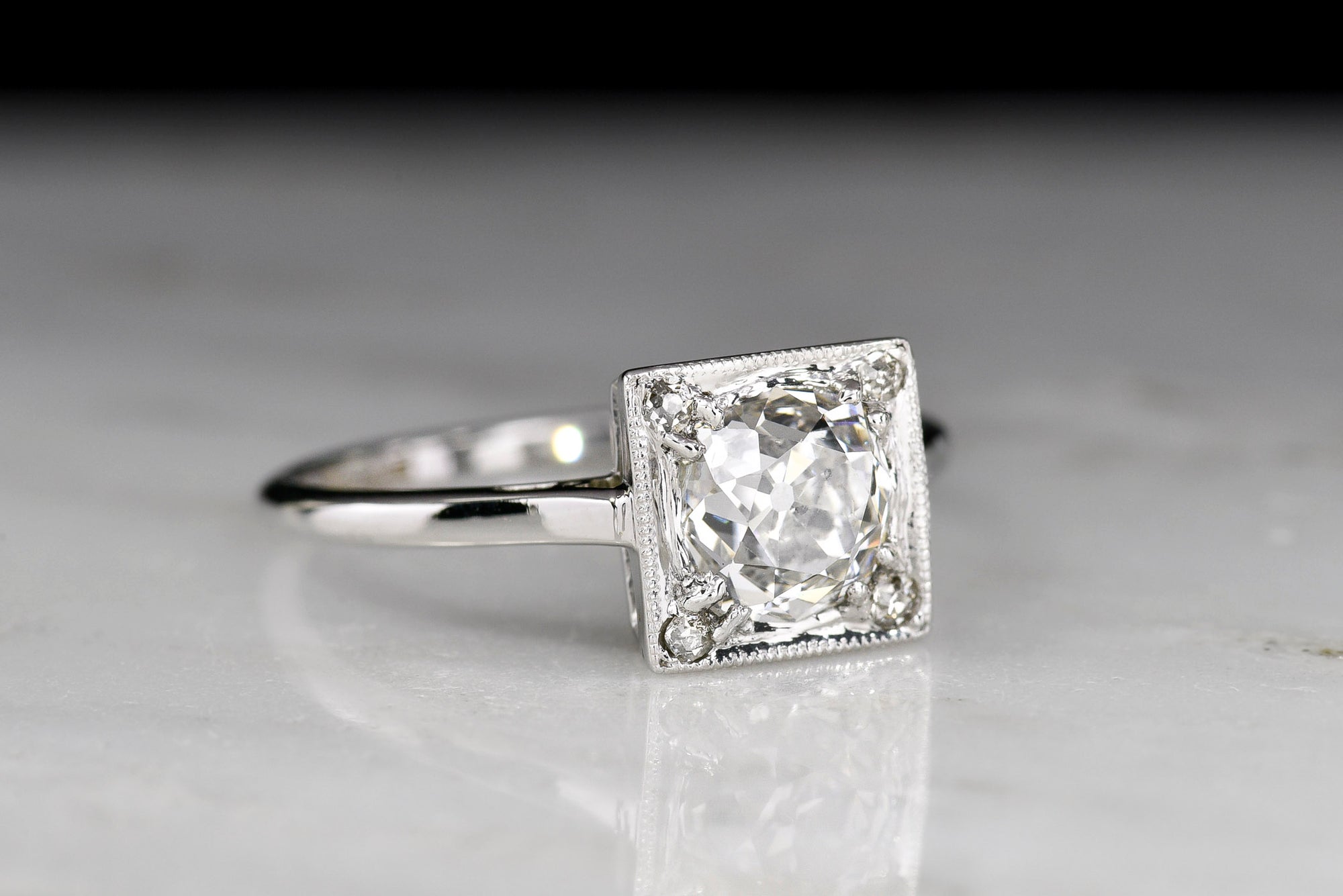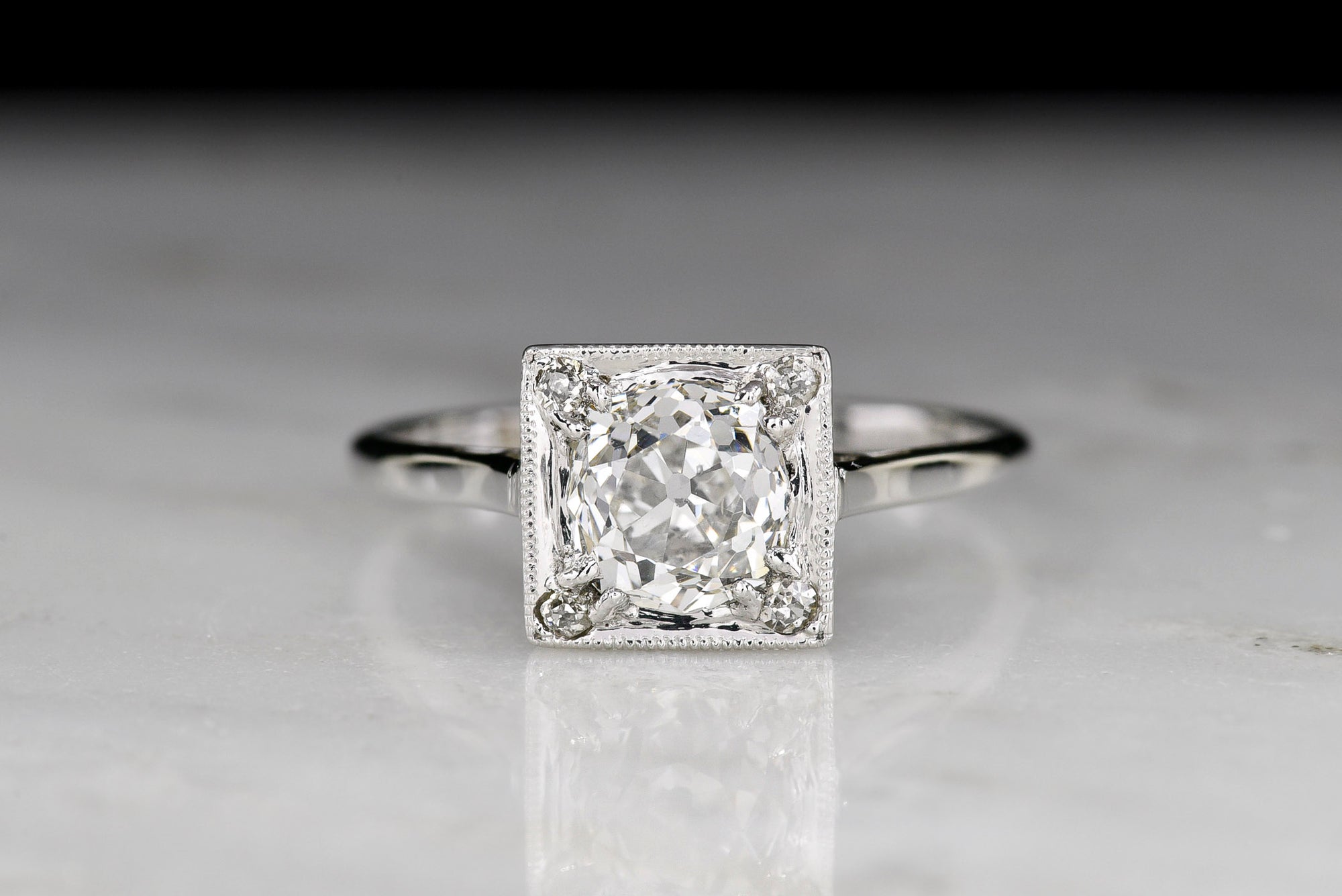 Sold Outc. 1930s Geometric Art Deco Engagement Ring with a 1.34 Carat Old Mine Cut Diamond Center
