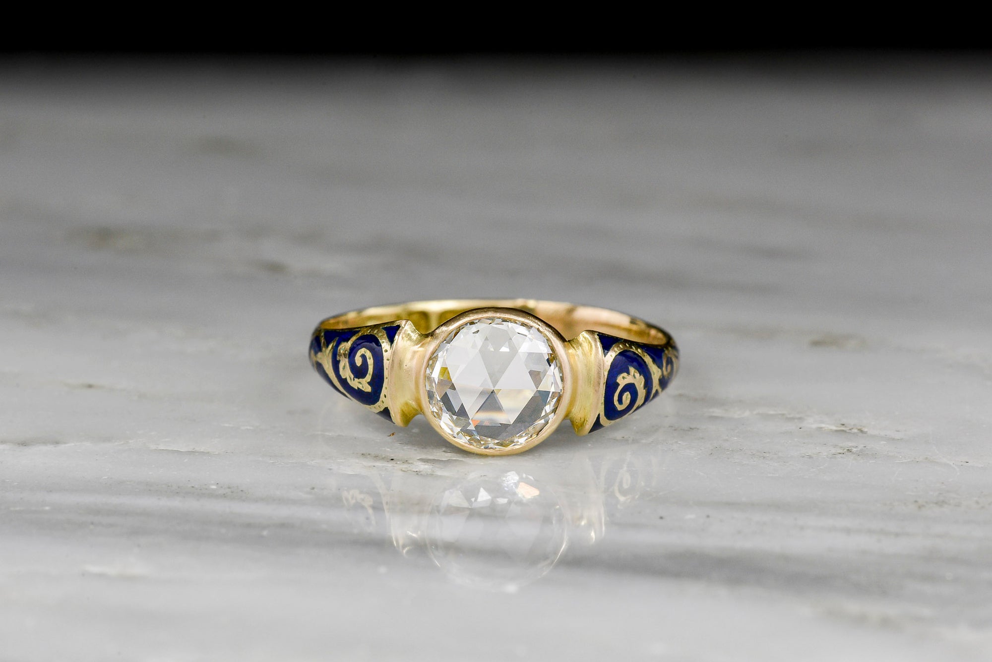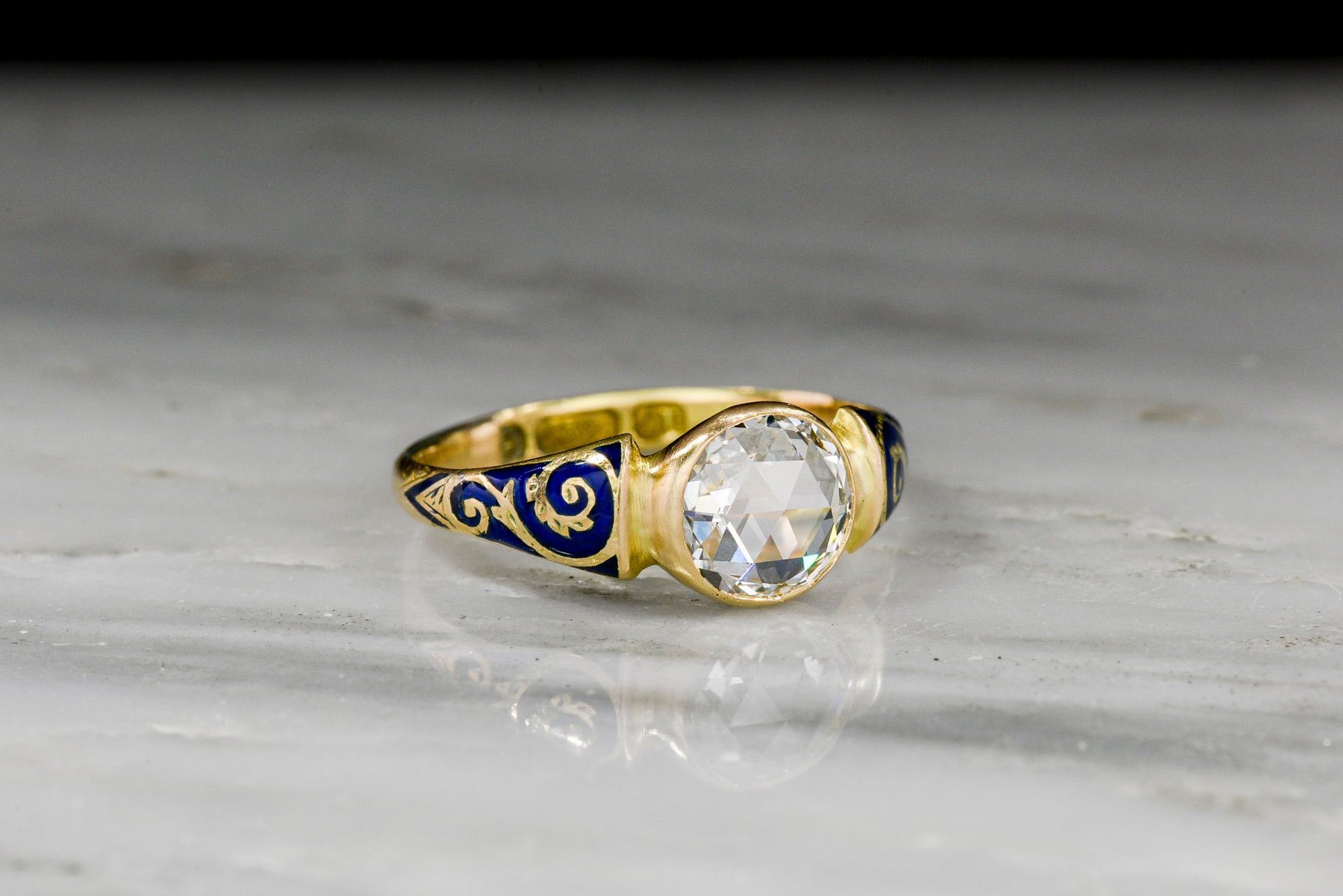 Sold Outc. Mid-Late 1800s English 15K Gold and Rose Cut Diamond Ring with Blue Accents