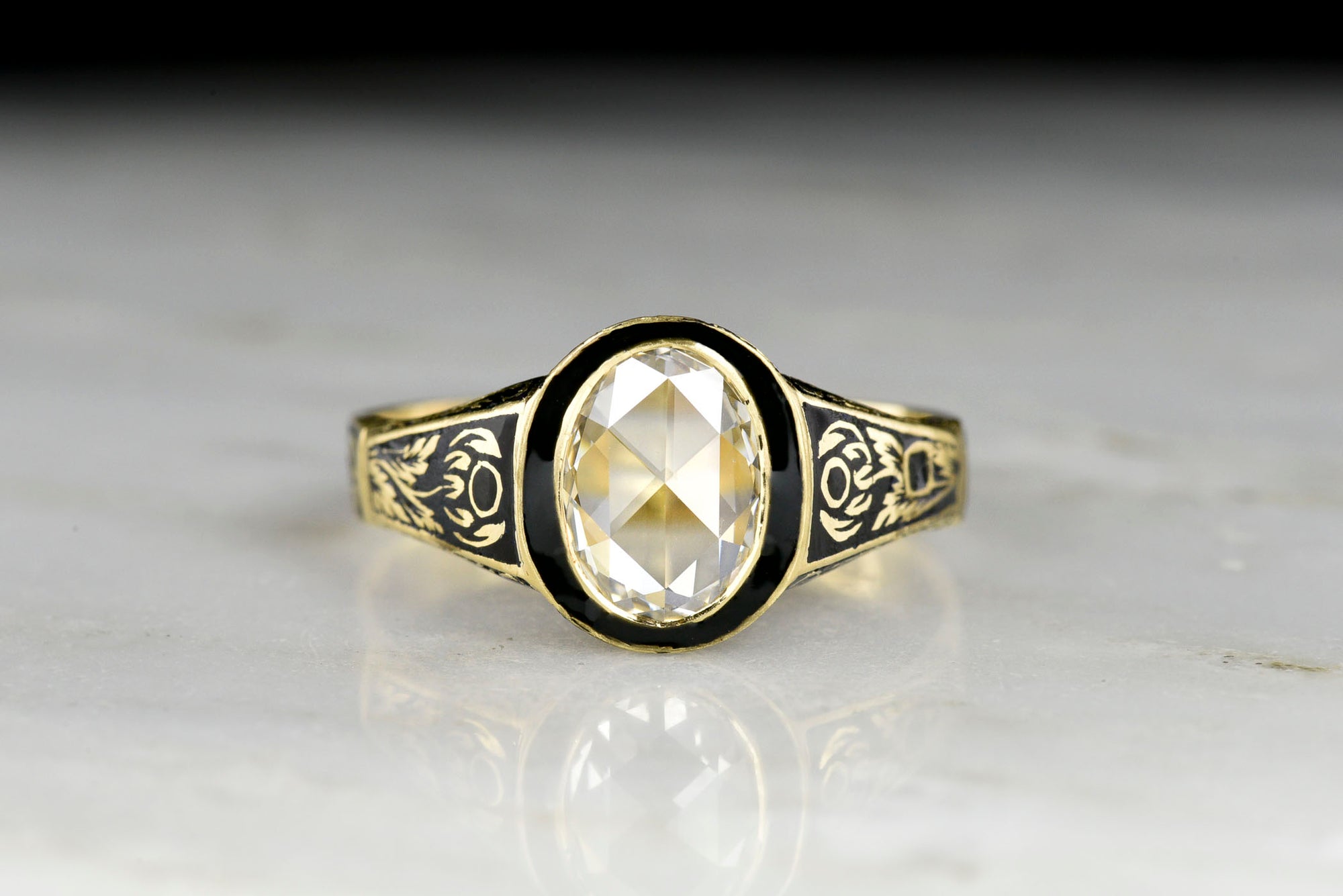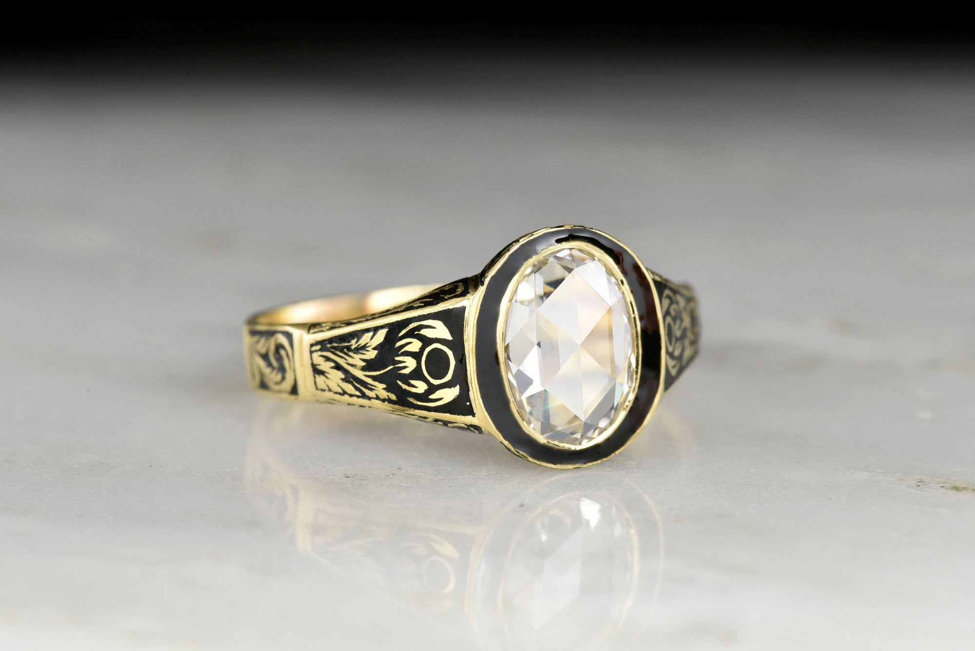 Sold OutVictorian Mourning Ring (London, 1844) in Gold and Black Enamel with an Oval Rose Cut Diamond