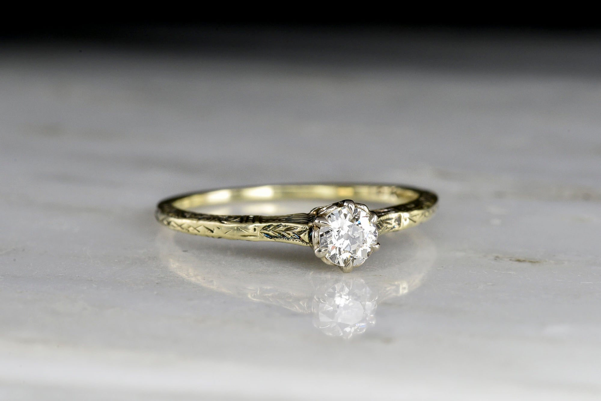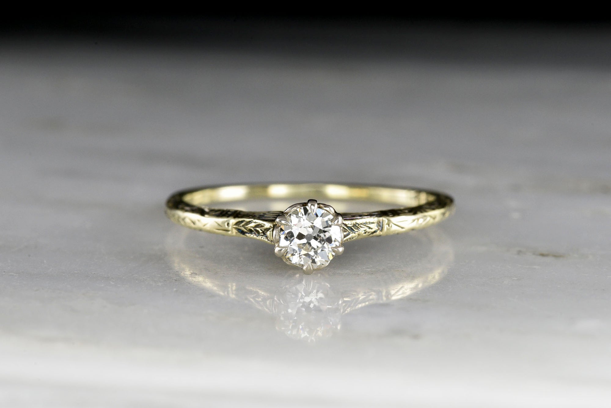 Sold OutEarly 1900s Green Gold Solitaire with Deep Engraving and an Old European Cut Diamond Center