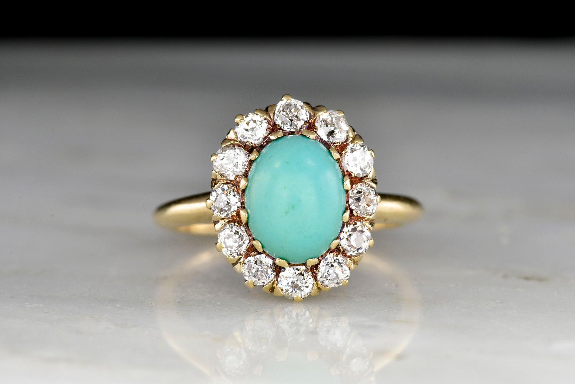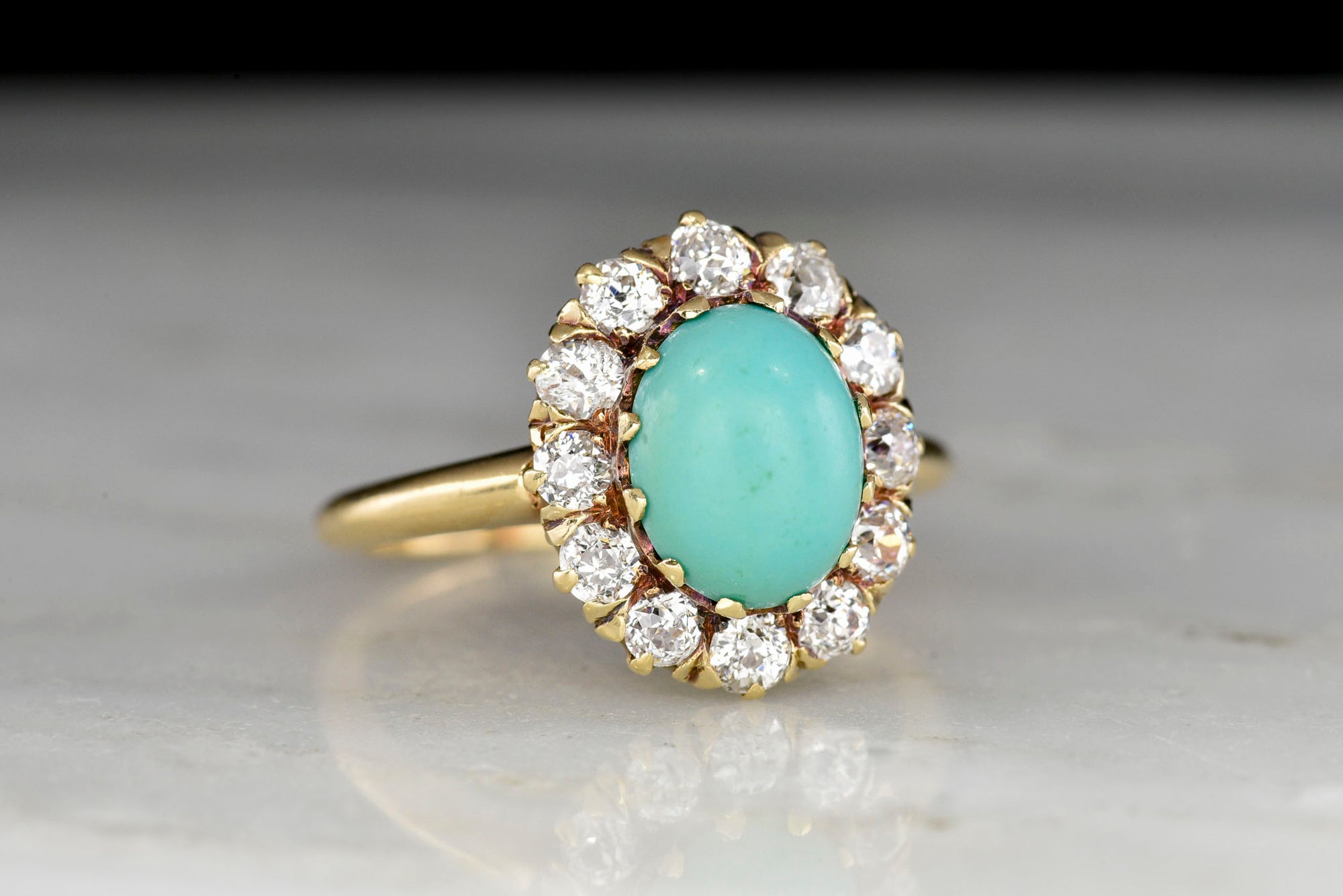 Victorian Old Mine and Swiss Cut Diamond Cluster Ring with a Cabochon Cut Turquoise Center