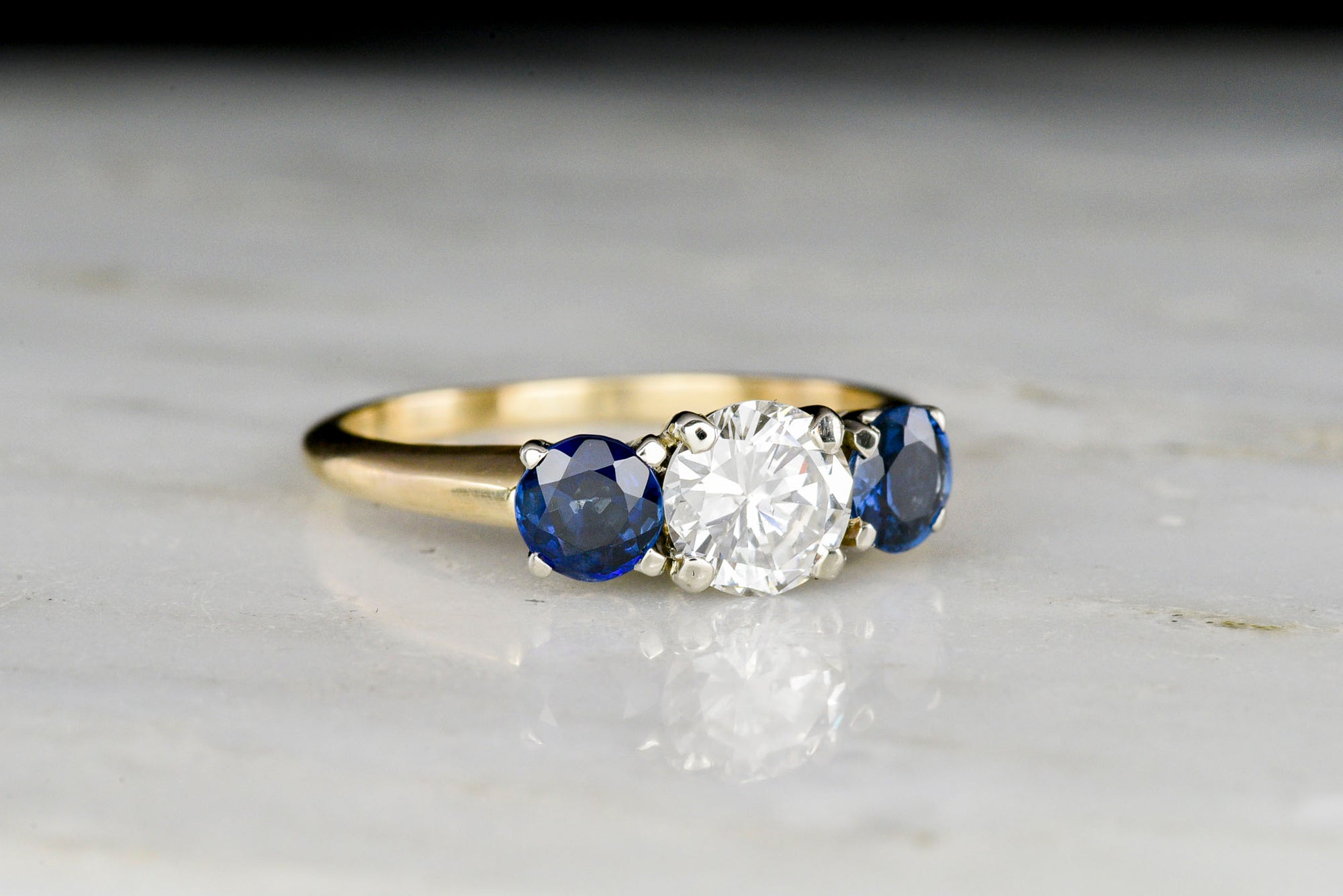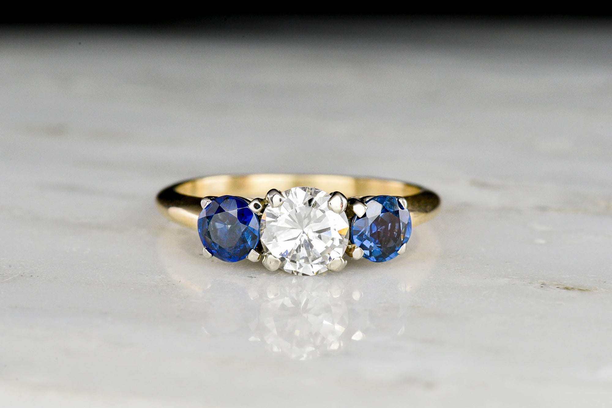 Sold Outc. Mid-1900s Three-Stone Diamond and Sapphire Ring with a Classic Midcentury Design