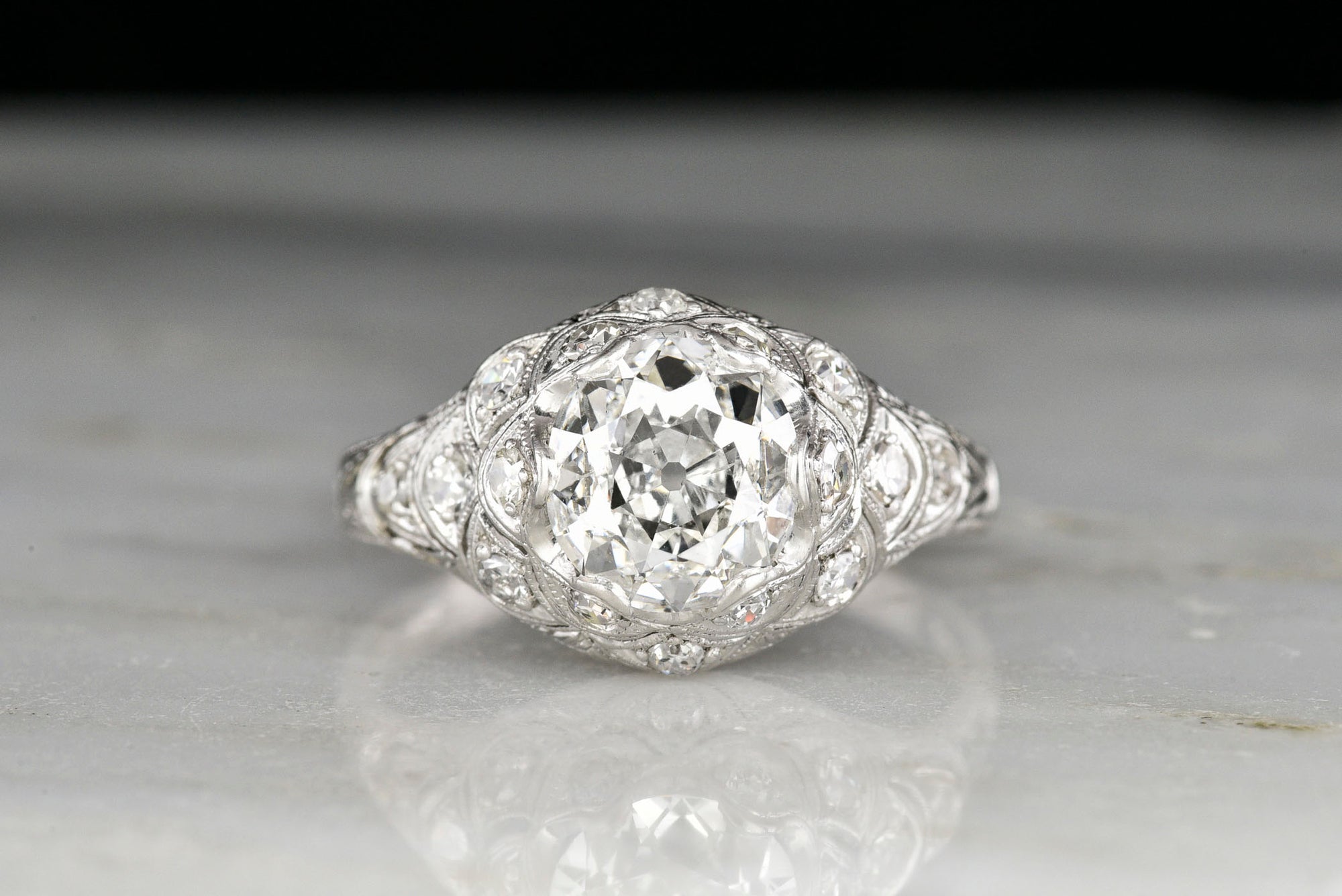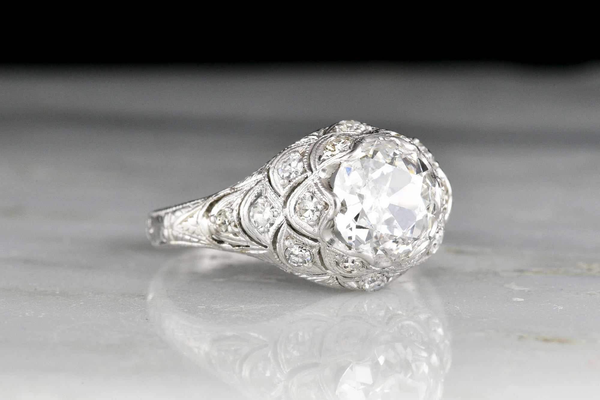 Sold OutOrnate Hand-Pierced Edwardian Platinum Ring with an Art-Nouveau-Inspired Scallop Motif