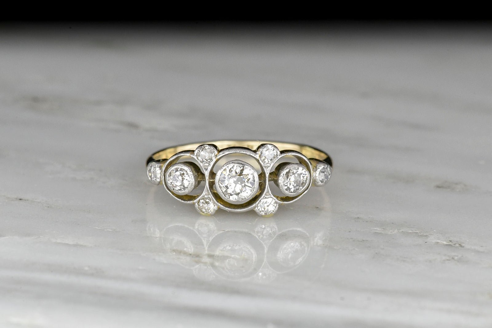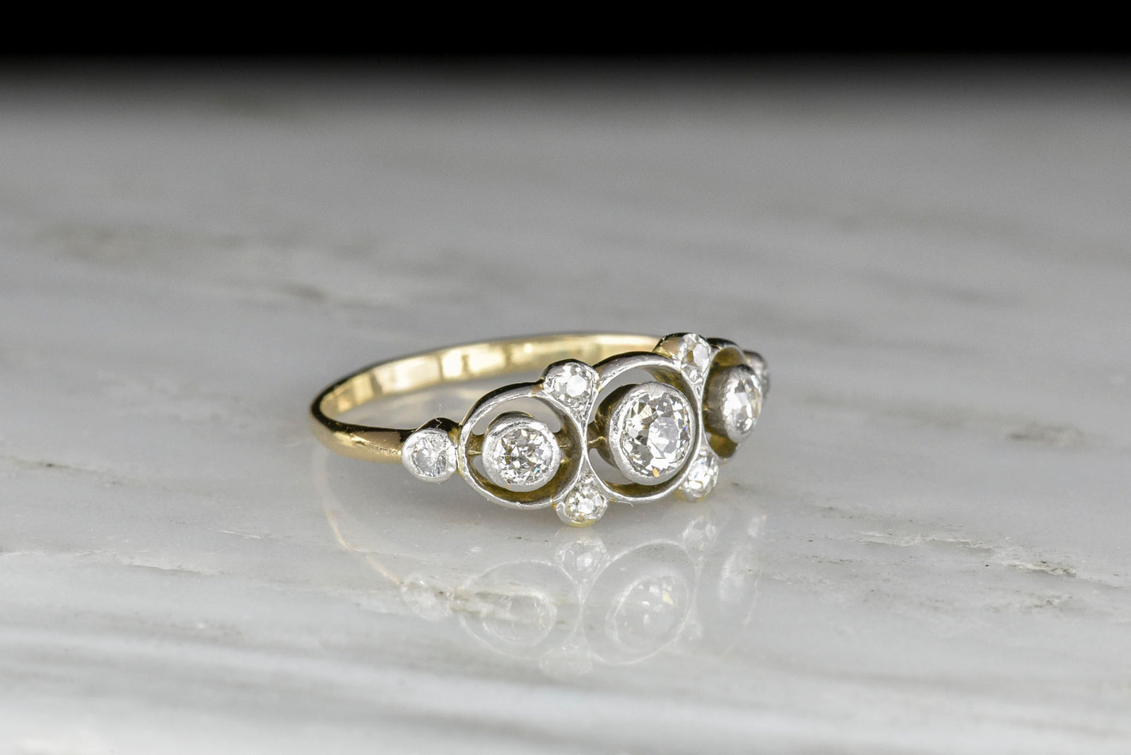 Belle Époque Gold and Platinum Ring with a Unique Floating Three-Stone Bezel Design