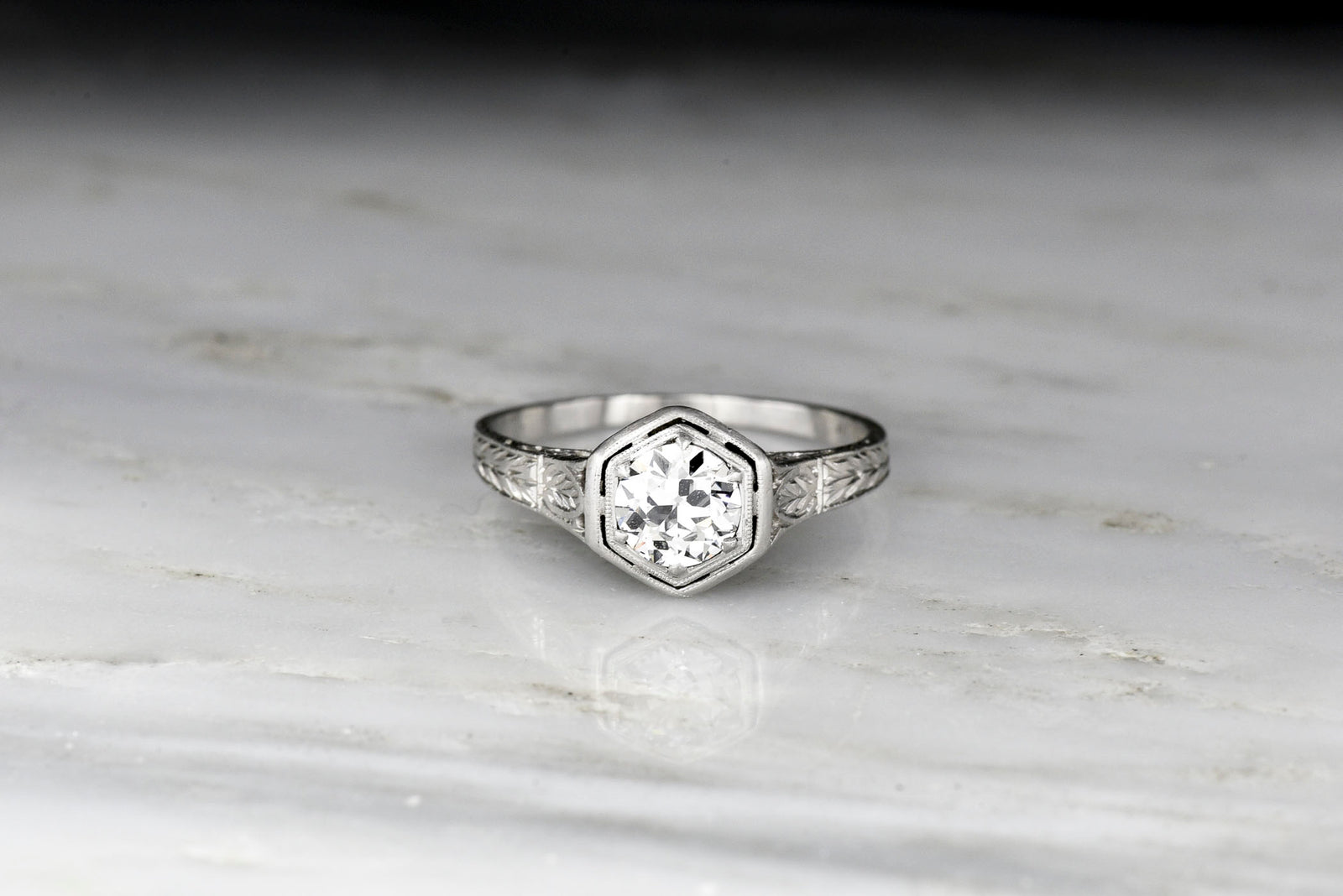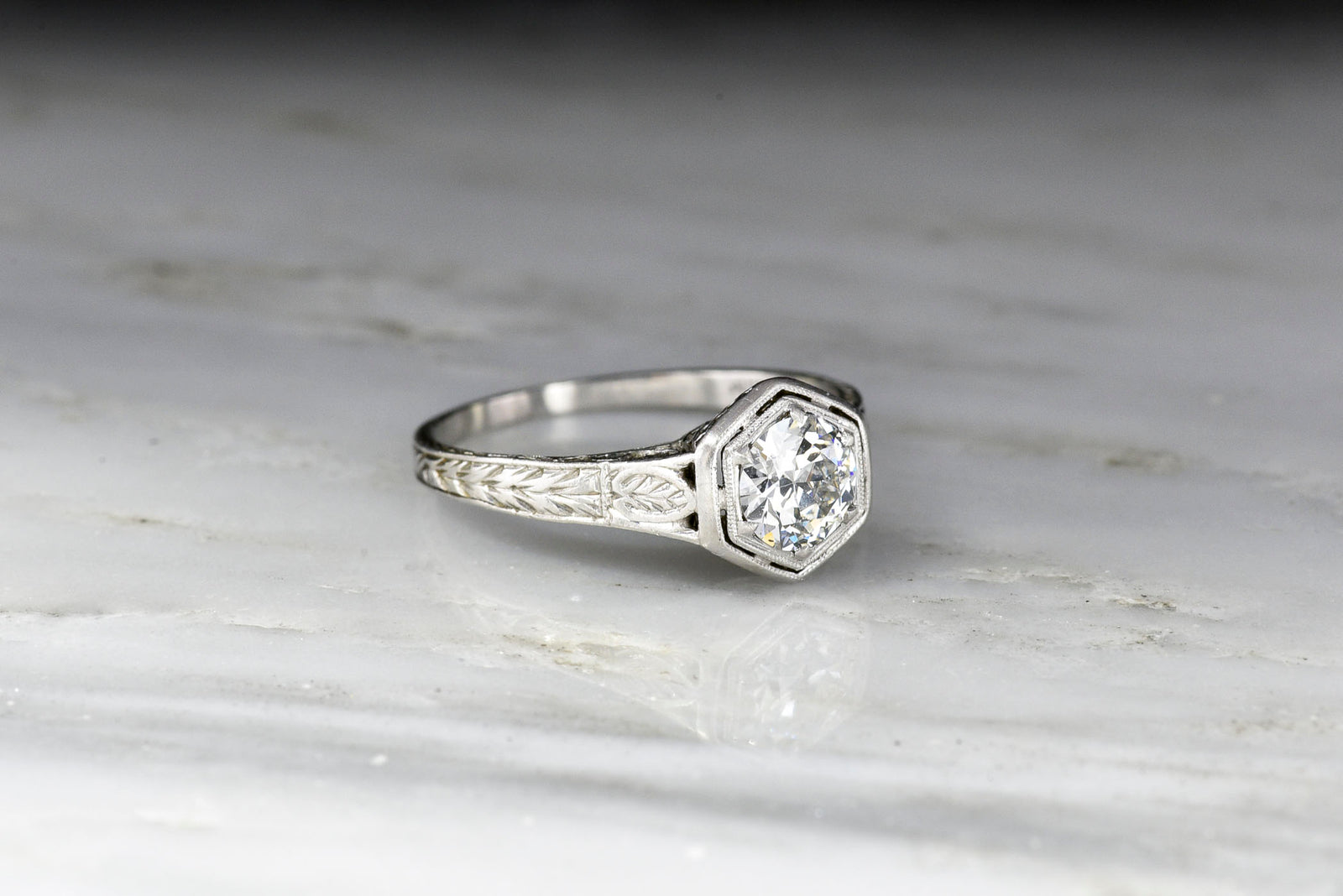 Sold Outc. 1910s Edwardian Ring with a Hexagonal Bezel-Set Transitional Cut Diamond Center
