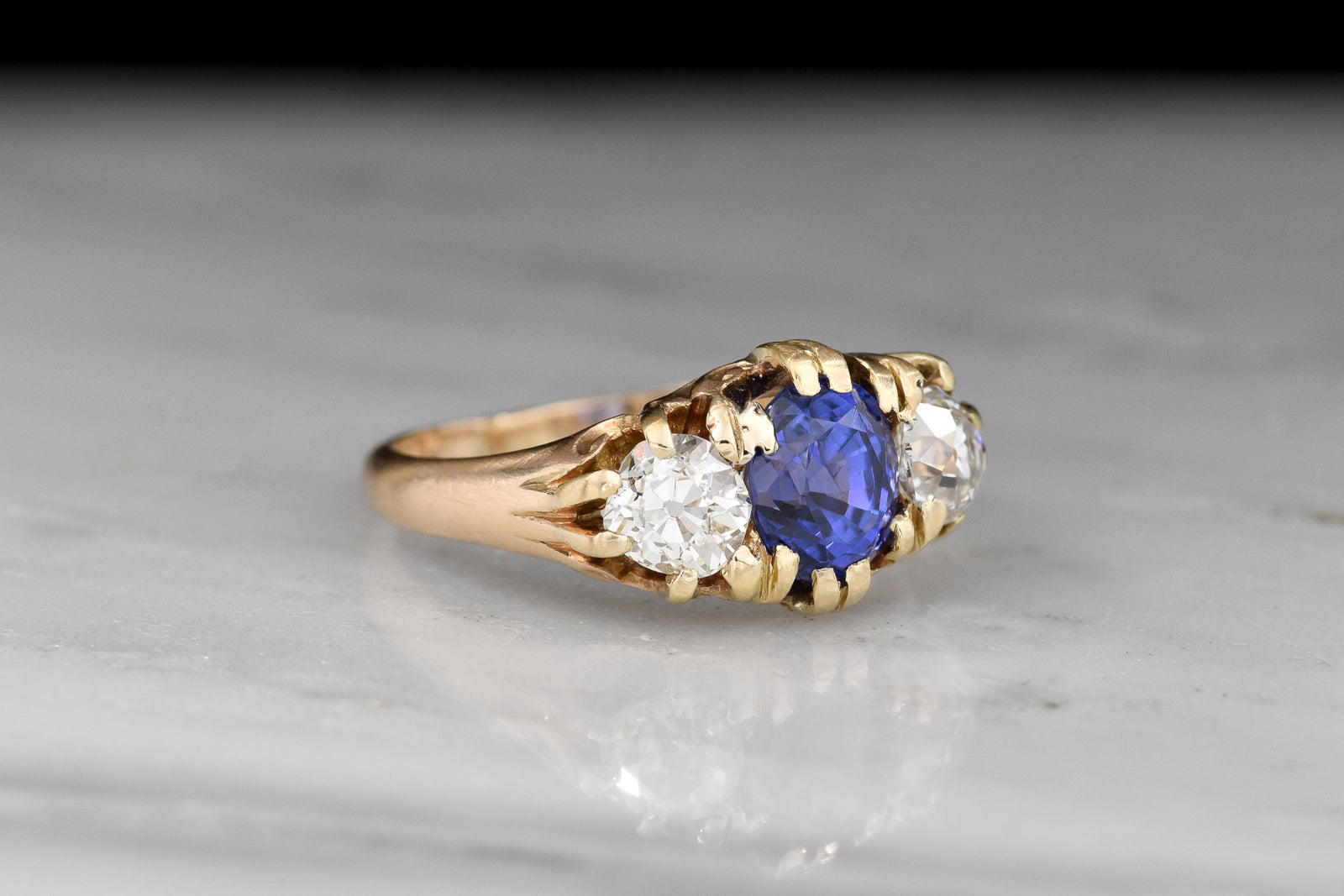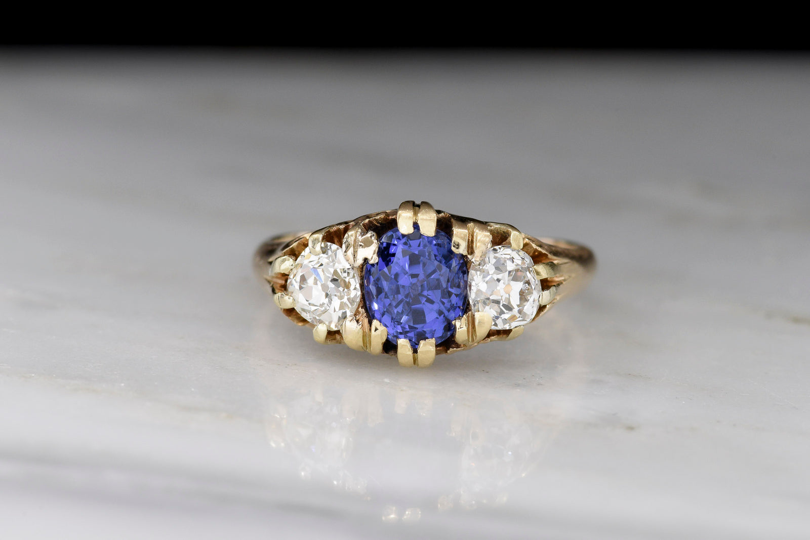 Sold Outc. Late 1800s Oval Sapphire and Old Mine Cut Three-Stone Ring