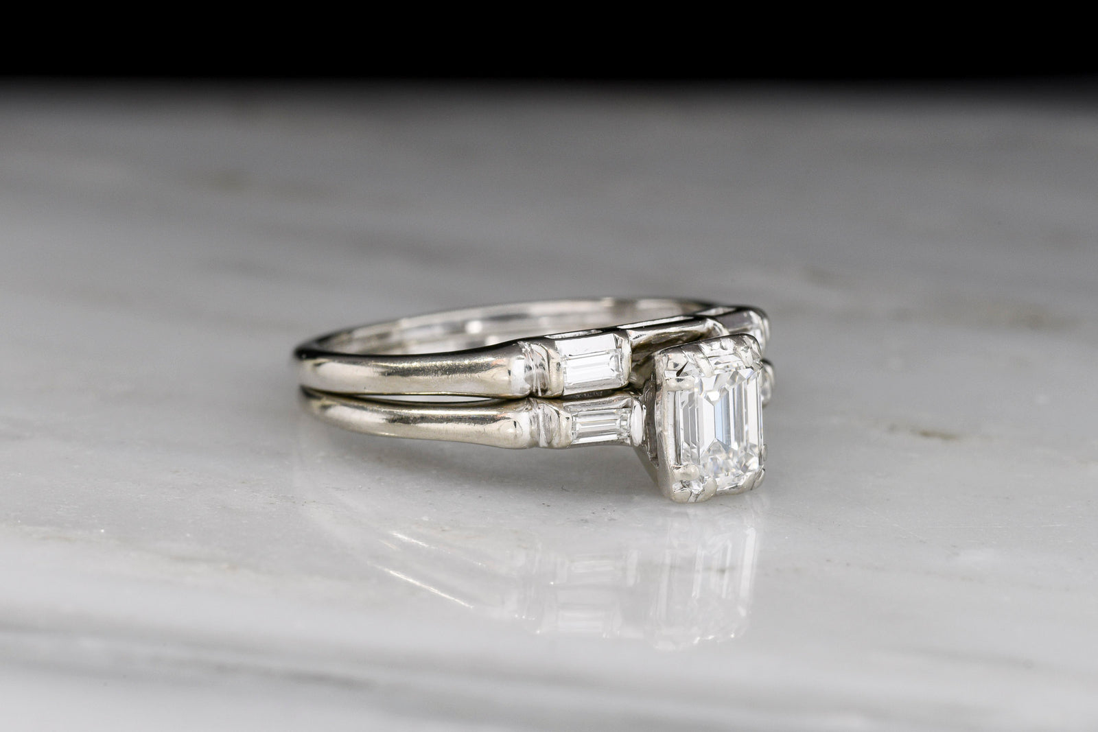 Sold Outc. 1950s Midcentury White Gold and Emerald Cut Diamond Wedding Set