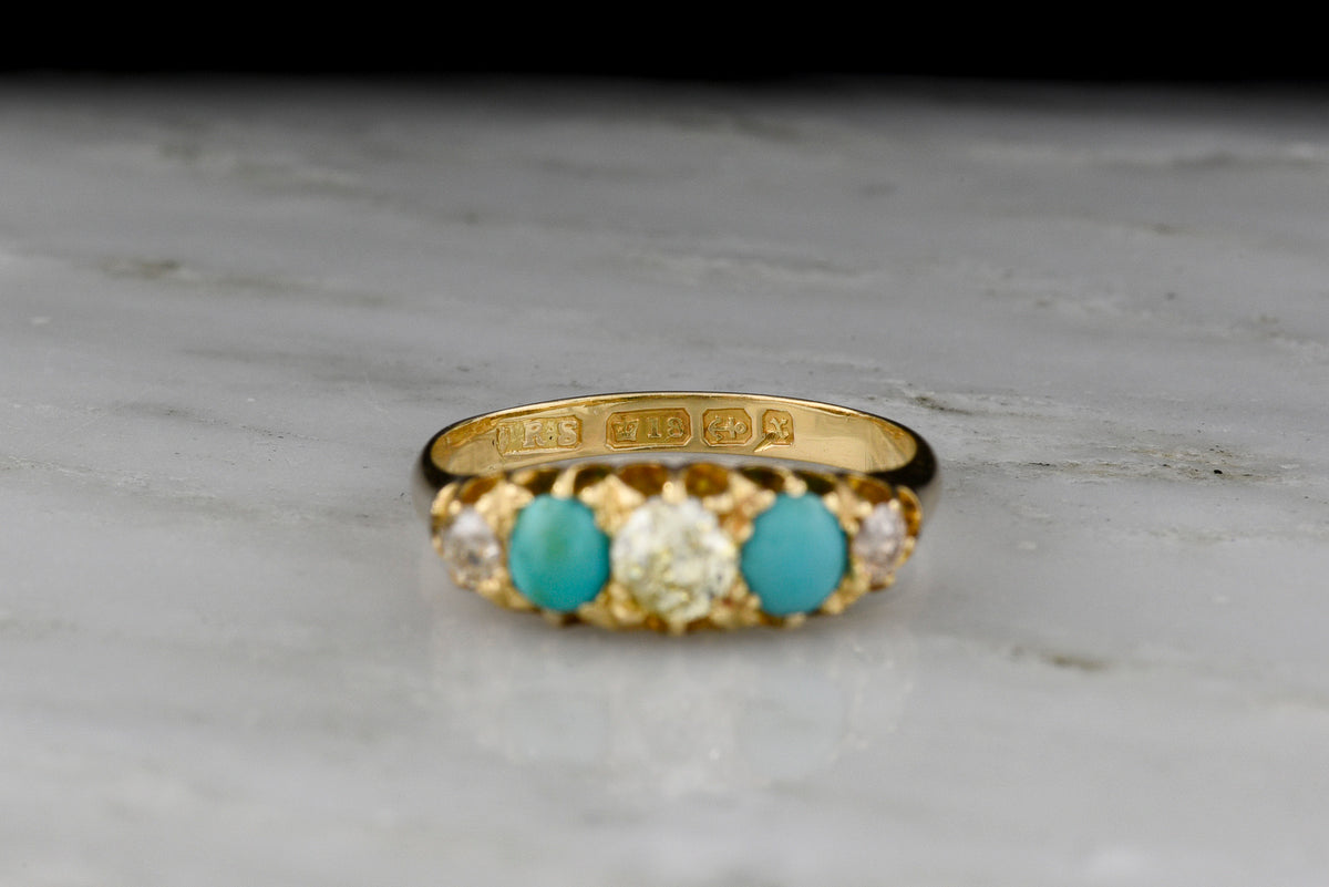 Stamps: the piece has full British hallmarks, including “HR•S” (presumably the maker’s mark—maker unknown); a crown next to “18” (denoting 18K gold); a sideways anchor (for Birmingham, England); and a stylized “X” for 1897 date of creation